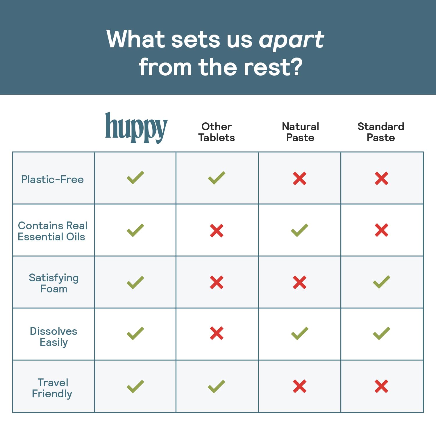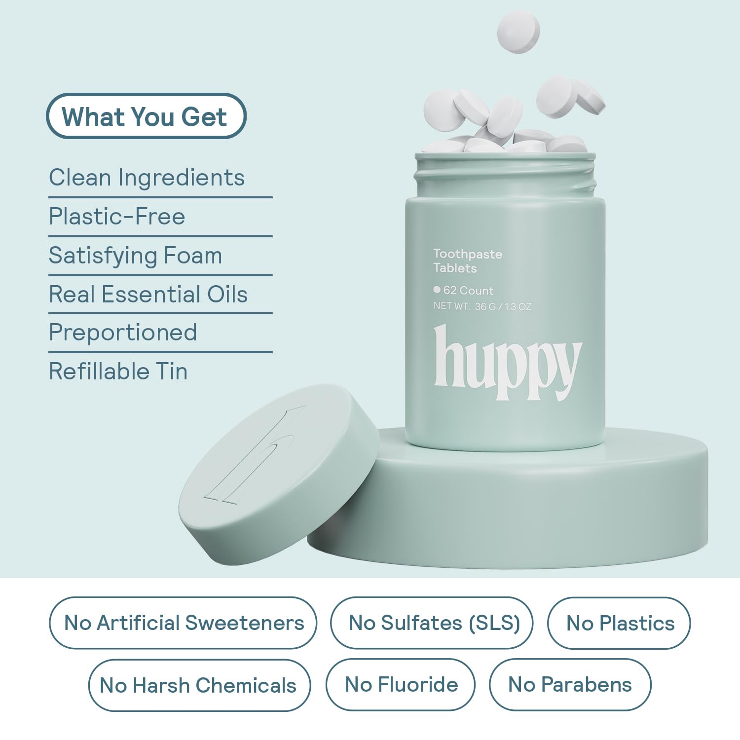 - BRIGHTEN & WHITEN YOUR SMILE: Huppy Toothpaste Tablets offer a blend of clean ingredients that will brighten and whiten your smile. Ingredients such as N-HA to keep teeth safe from decay, xylitol to ward off unwelcome bacteria and coconut oil to keep your gums happy and healthy.