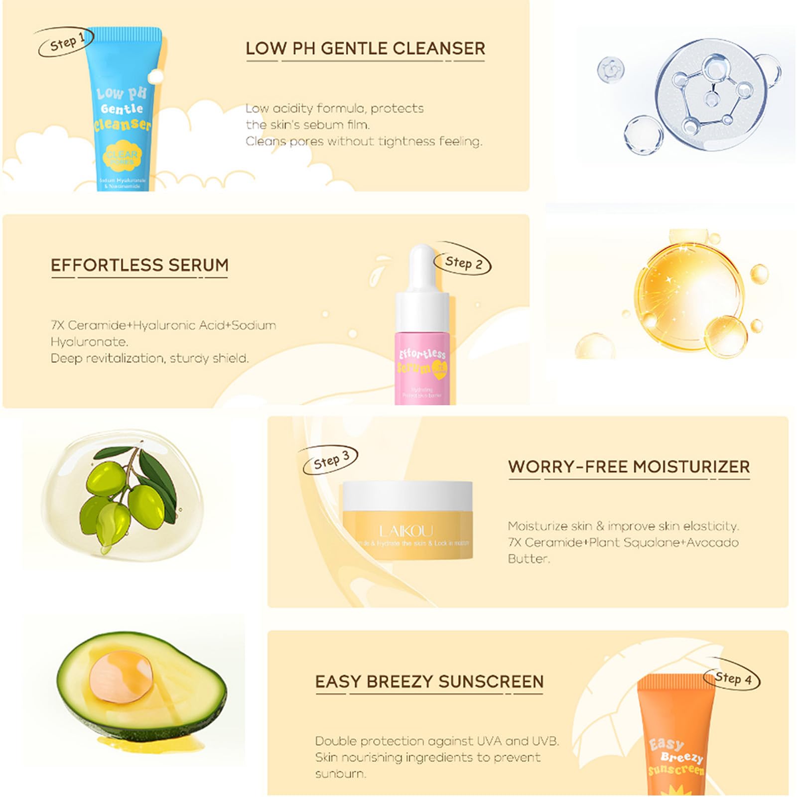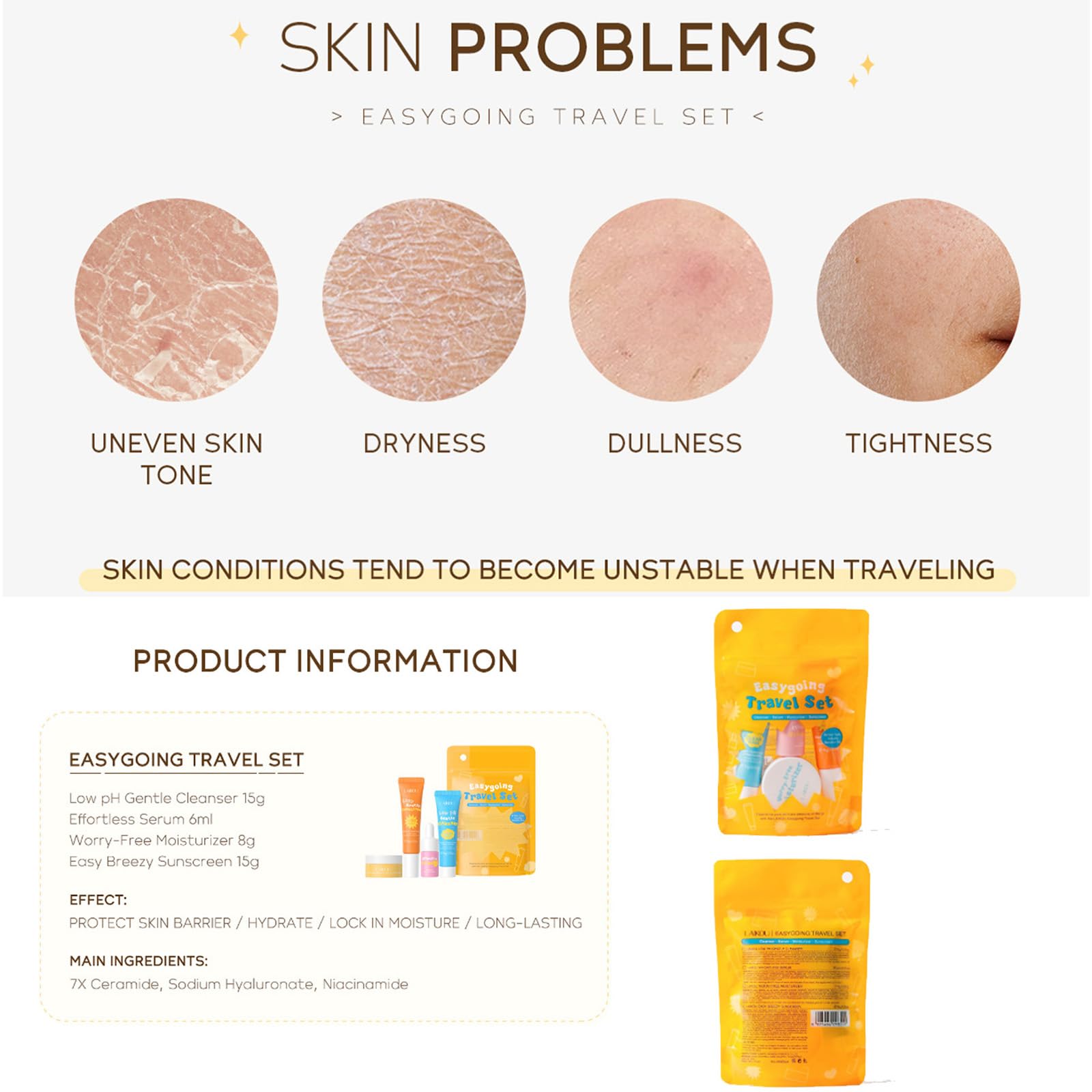 - 【Skin Care Set Travel Kit】This 4-piece travel size face skin care set contains facial cleanser, facial cream, facial serum, sunscreen.Hydrating & moisturizing the skin and travel size suitable for vacation.
