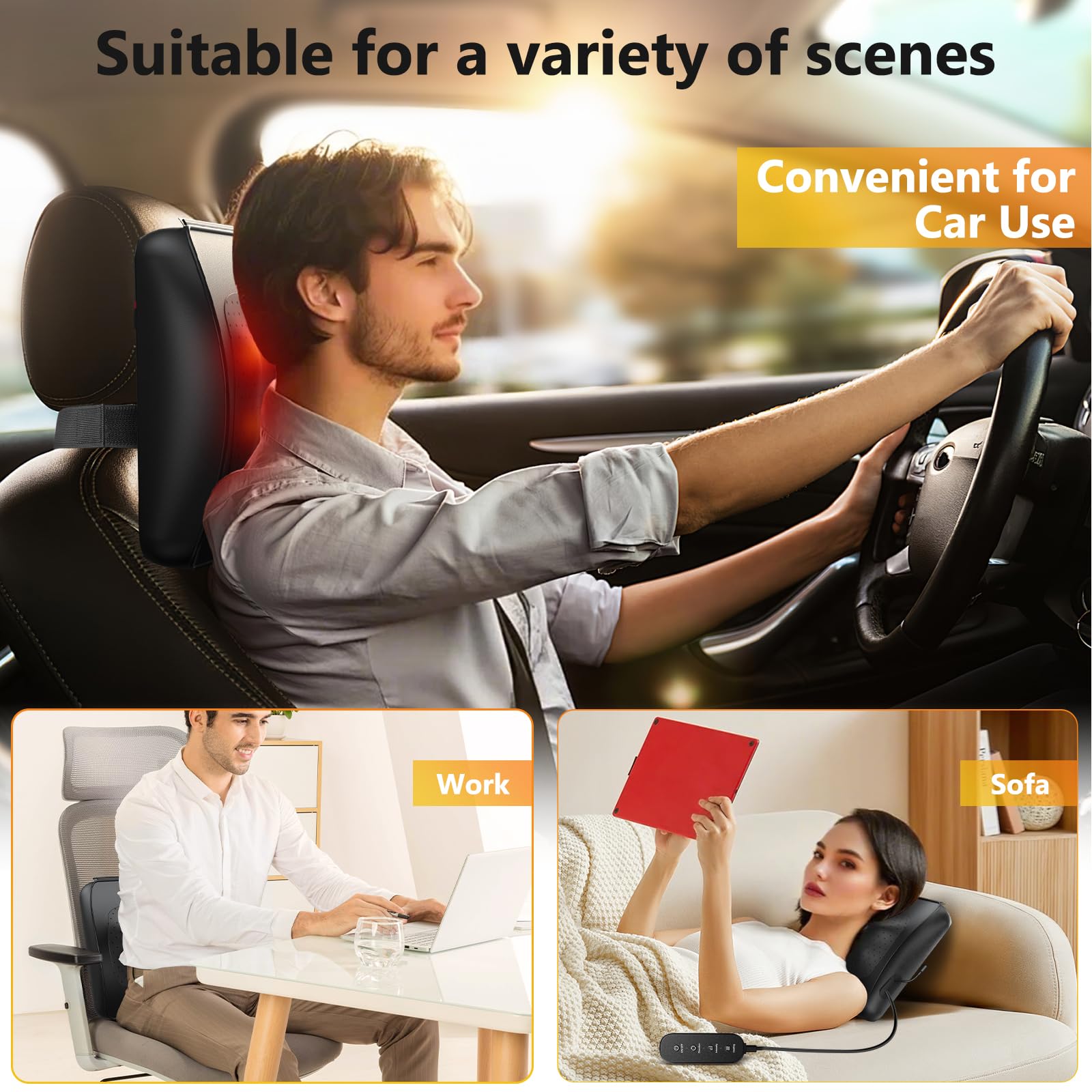 - 【Portable Massage Pillow】Shiatsu back massager comes with regular adapter (110-240V) and car adapter (12V). You can get a professional massage at home, in the office, or in your car.