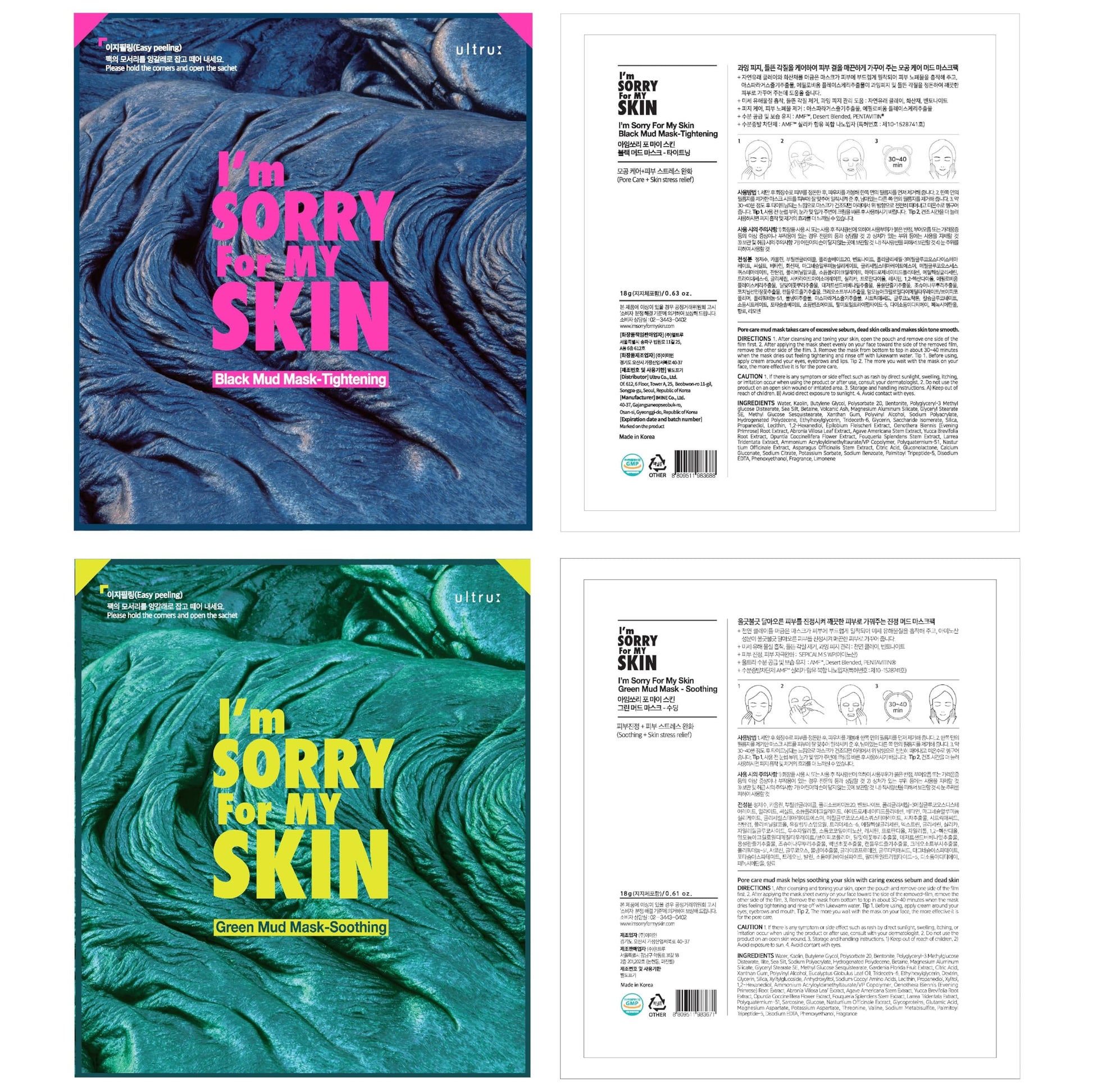 I'M SORRY FOR MY SKIN Bentonite Clay Mud Sheet Masks Set, Korean Skin Care, Exfoliating Face Masks with Volcanic Ash, Sebum Control, Pore Minimizer, Tightening, Soothing (Black 2pcs & Green 2pcs)
