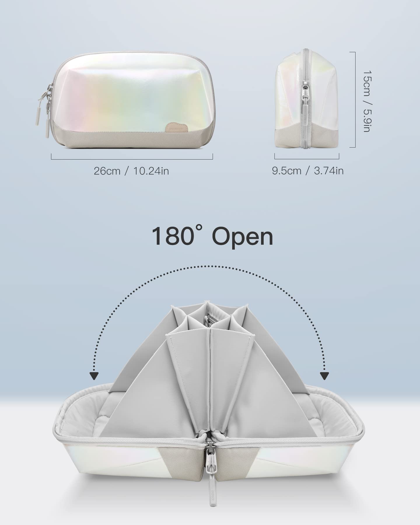 - 180° Open: The interior is in origami-style, which allows you to open the bag 180° to take what you need. Multiple pockets and elastic bands in the bag help organize accessories in an orderly way and keep items in place to avoid slipping