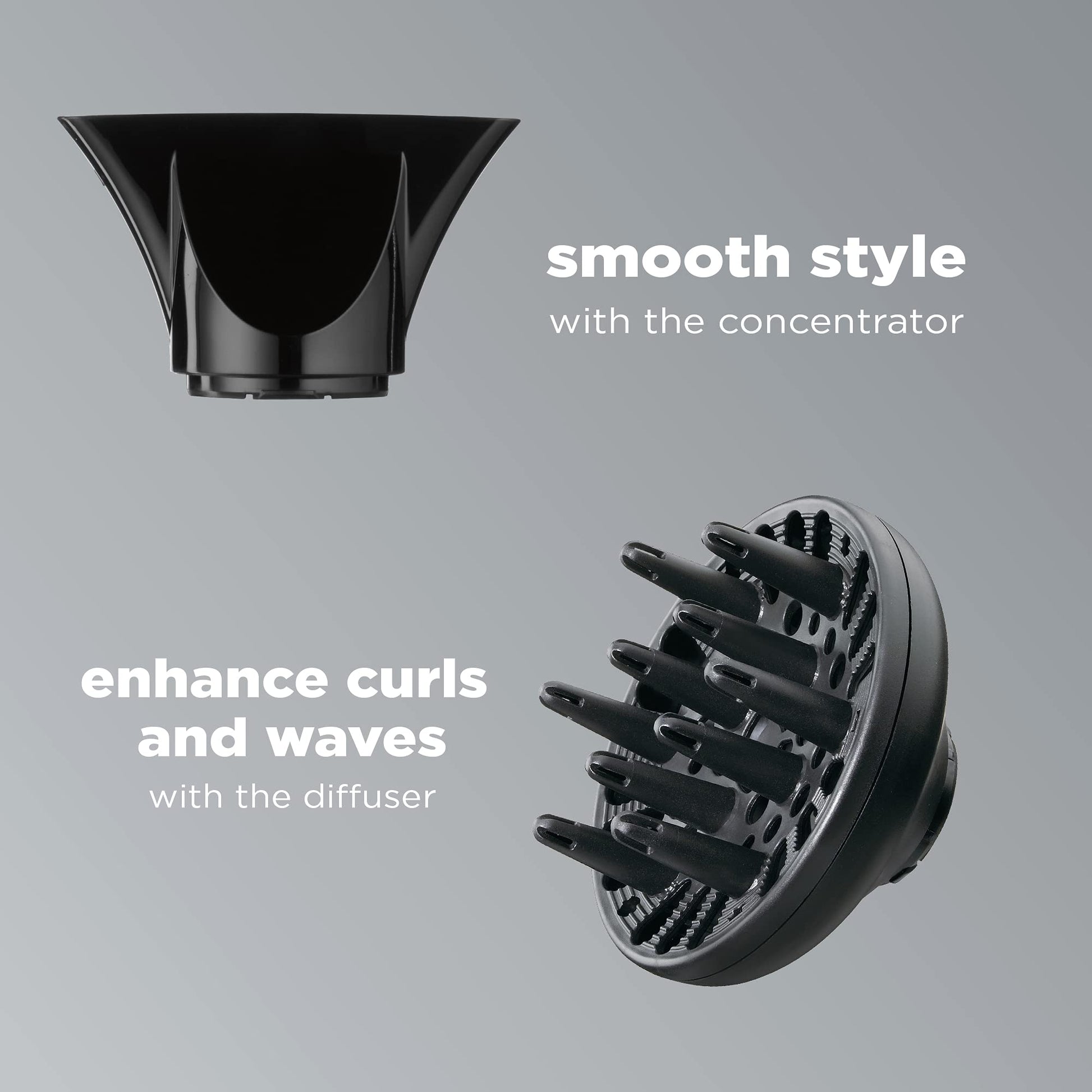 - Frizz Free Drying: Features Ionic technology for added shine and less frizz; Powerful AC motor delivers up to 50 percent faster drying time and 3x longer hair dryer life; Includes concentrator for pinpoint styling and diffuser to enhance curls and waves