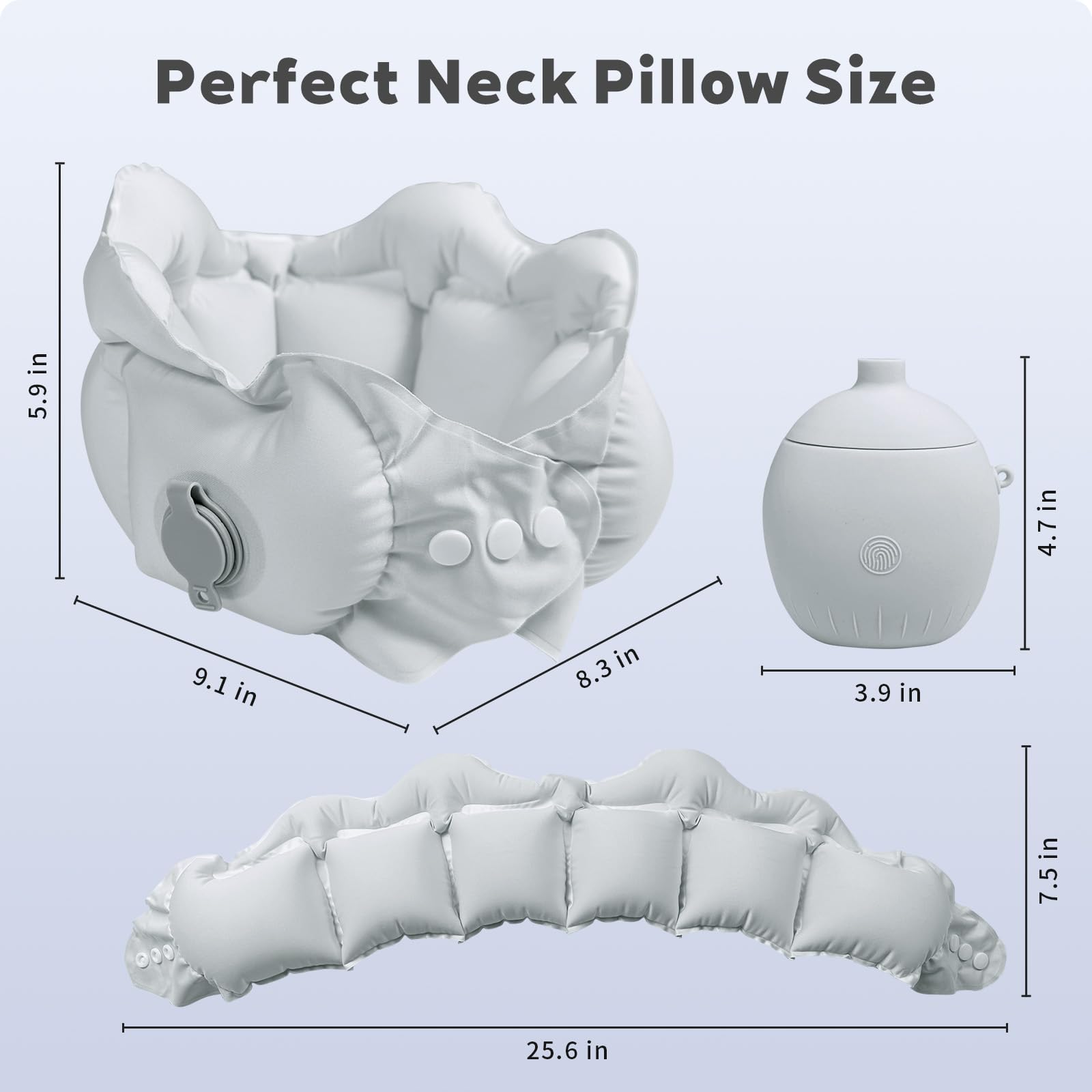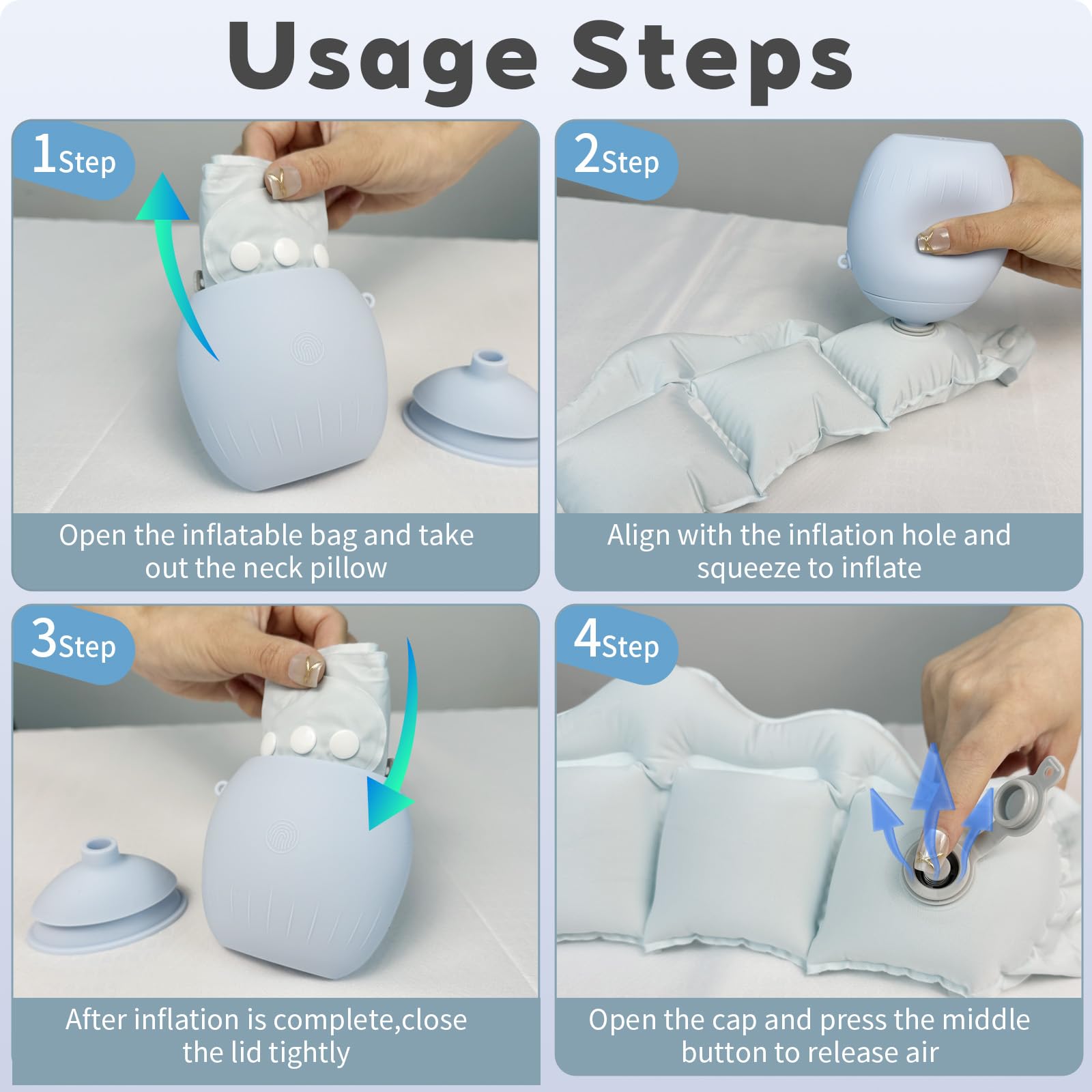 - Easy to inflate and deinflate:The inflated neck pillow compact,easy to pack, inflates and deflates quickly, While deflated it is small enough to fit in the sillicone storage,store easily in your pocket or purse,and provides 360 great neck and head support for airplanes,car rides,travels long distances.