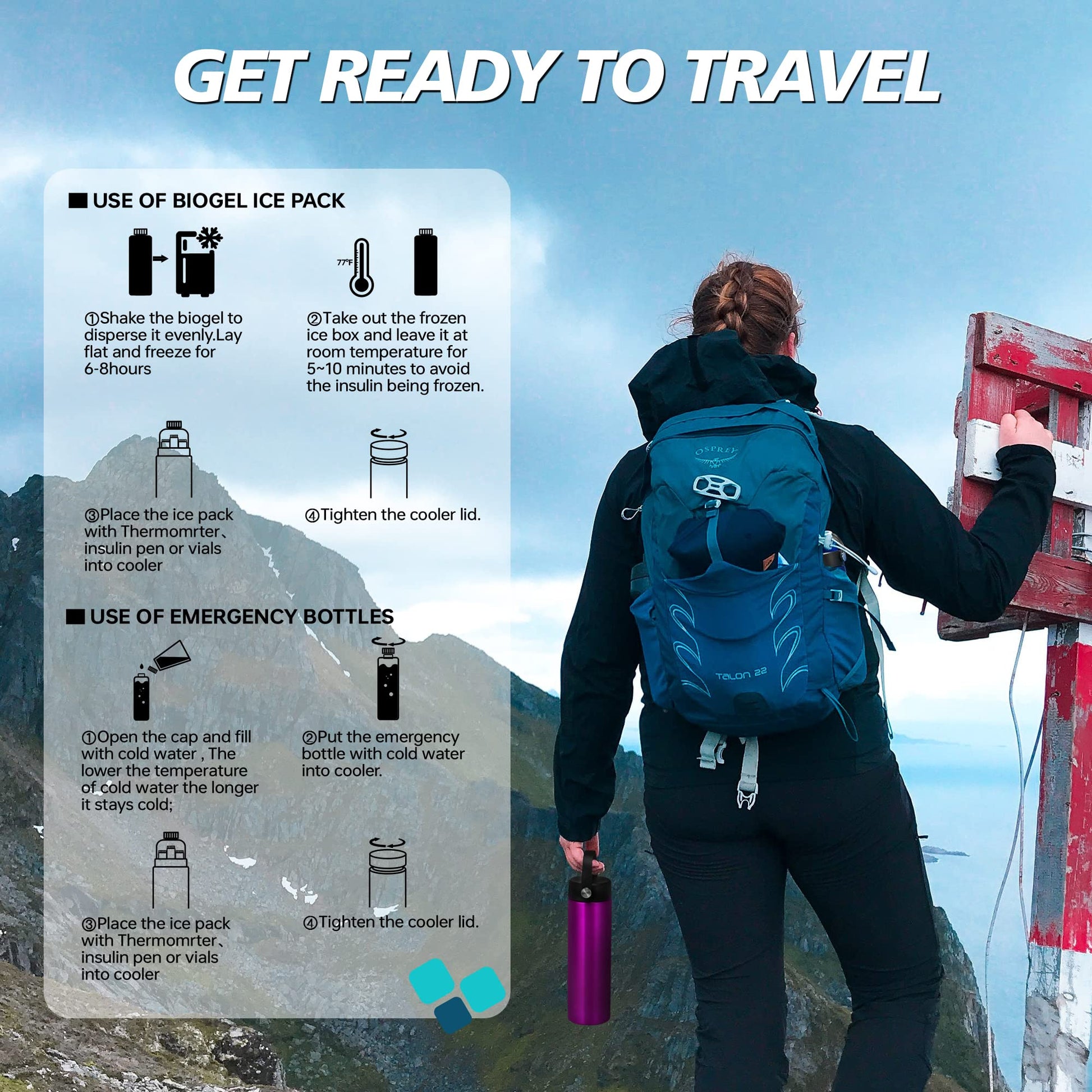 - 2 COOLING METHODS: 1) The blue ice pack with biogel provides 48 hours of cooling time; 2) The white ice water bottle adds an additional 12 hours of cooling time when filled with ice water; So you can travel without worrying about your medication expiring