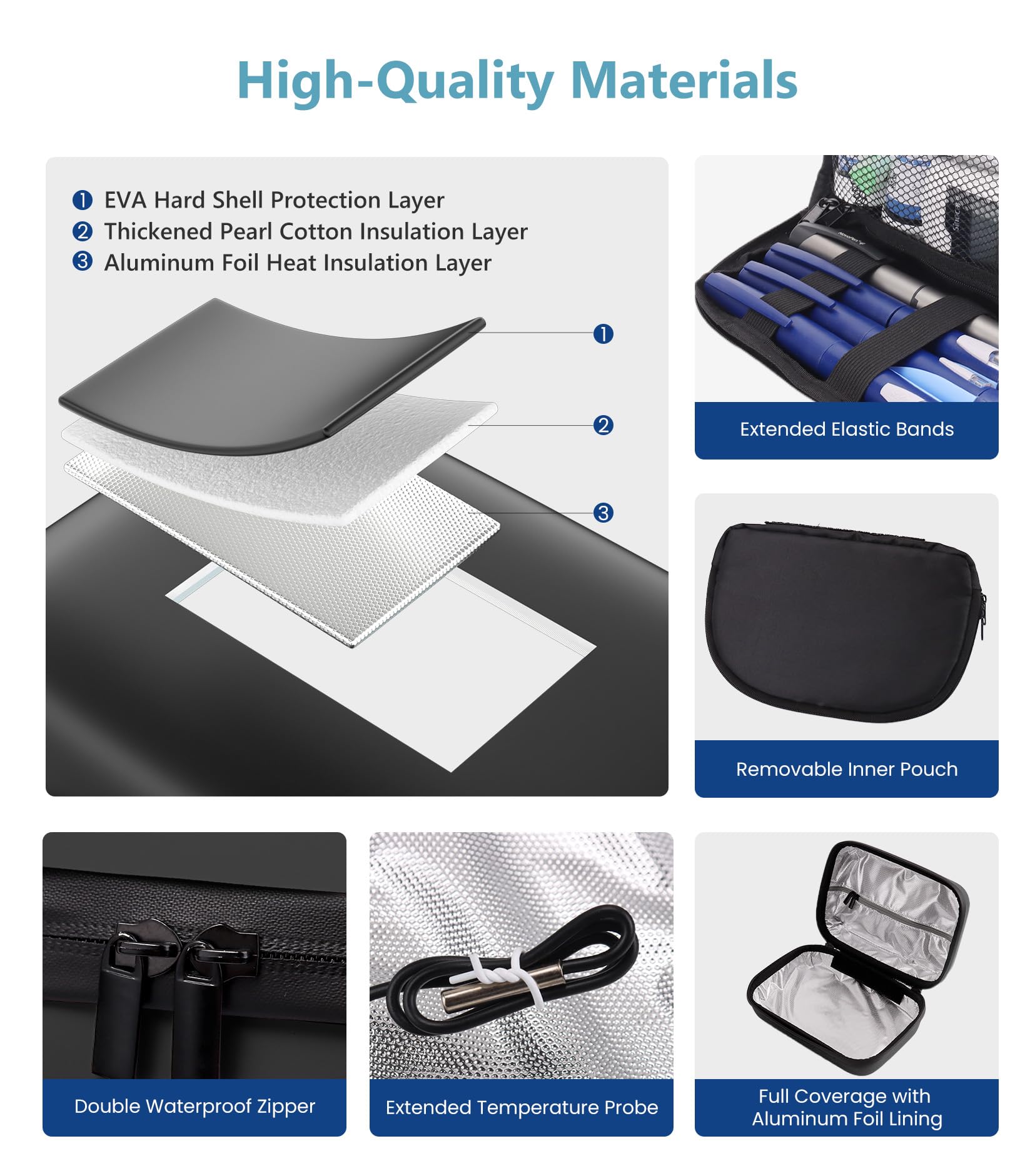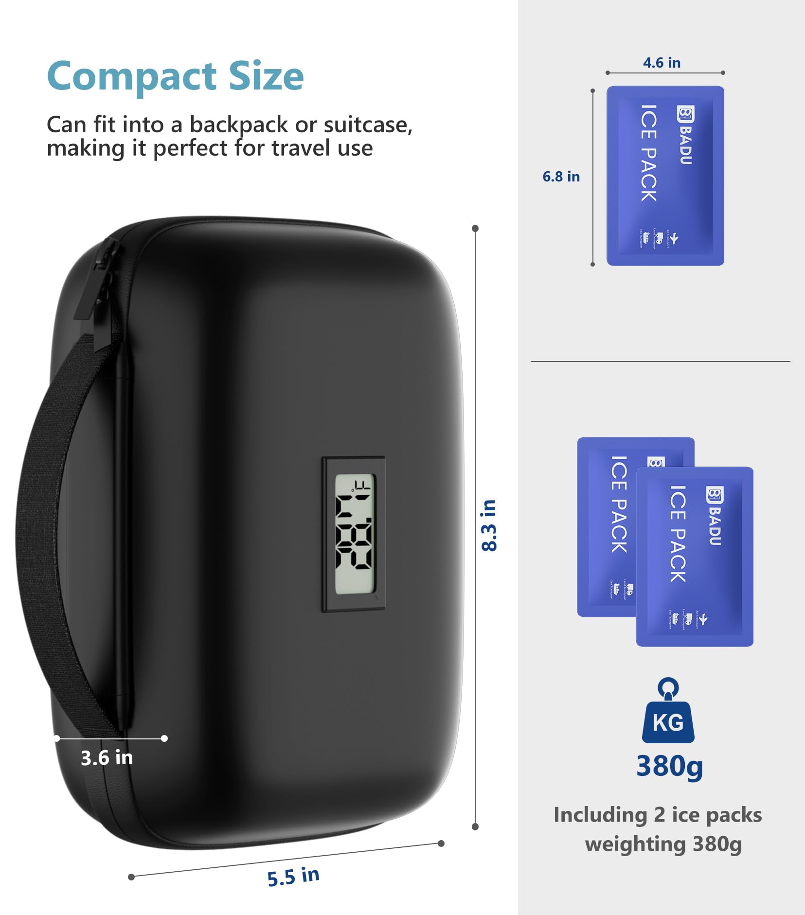 - Enhanced Insulation: The insulated cooler bag features a durable EVA hard shell, aluminum foil, and thickened pearl cotton for superior insulation. A waterproof zipper further minimizes temperature loss, keeping your insulin safe in any condition