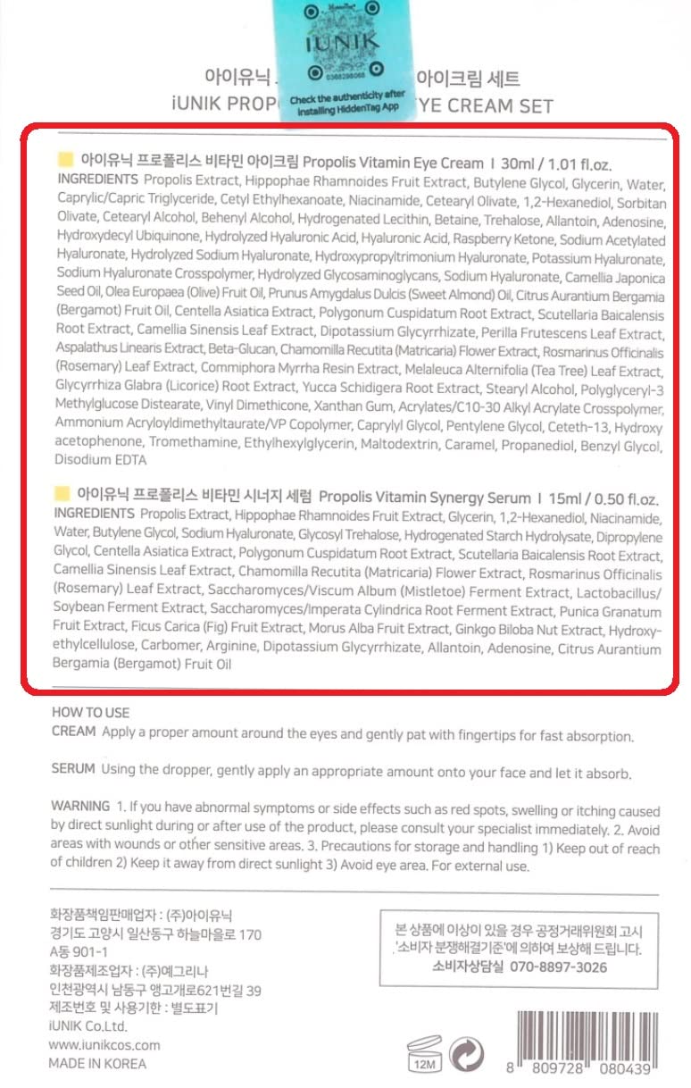 - PROPOLIS VITAMIN EYE ESSENCE - Incorporating Propolis Extract, Idebenone, and a host of other ingredients, this eye cream will help fight against worn skin, dark circles, dryness, and more.