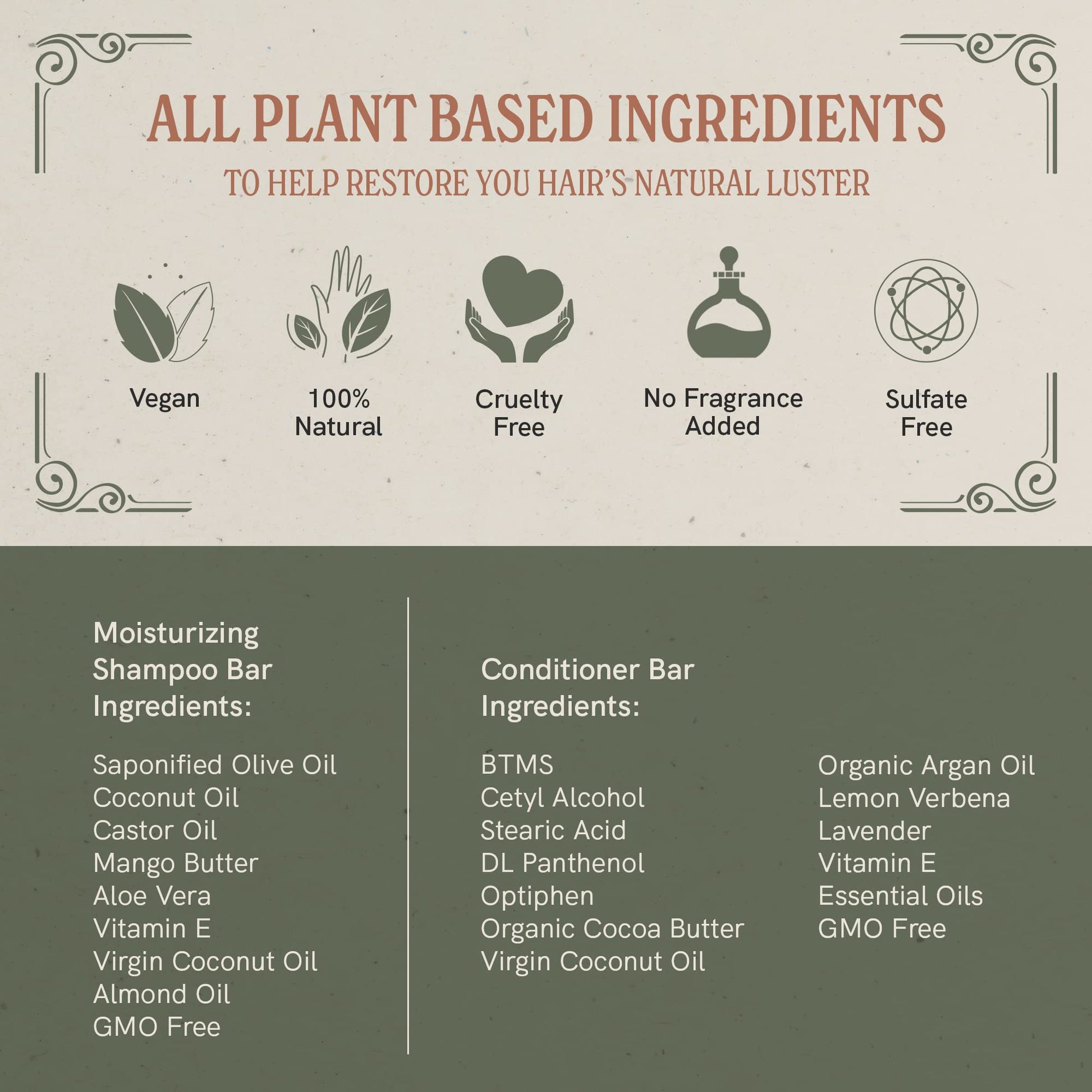 - 100% Plant Based: alfalfa grass with antioxidants, helps the conditioner restore hair’s luster. Shampoo’s natural ingredient formula helps neutralize hair damaged by chemicals and chlorine. Bars and packaging are 100% recyclable.