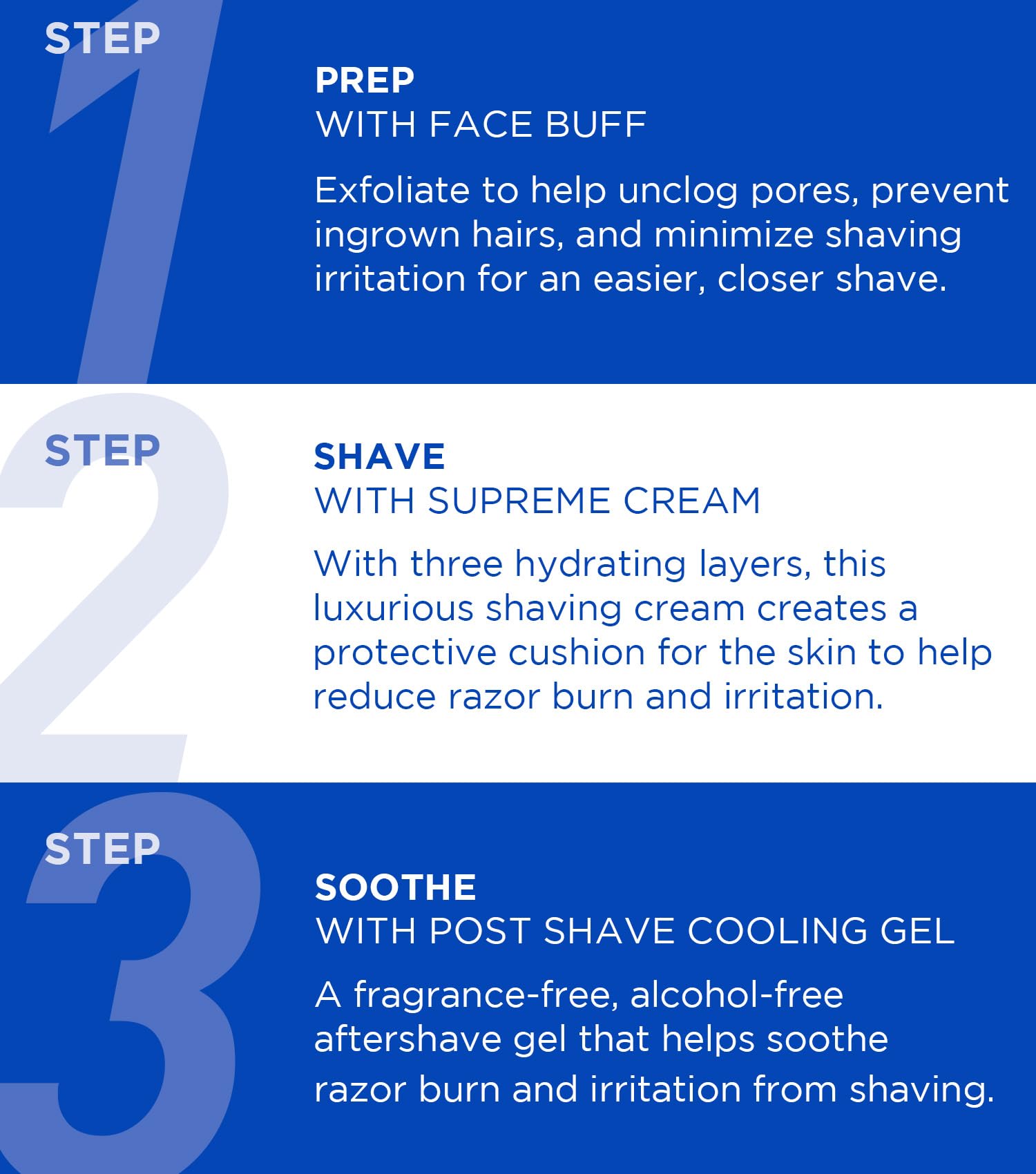 Details: Get a smooth, comfortable shave in three easy steps with the Three You Need Shave Set. Scrub, shave, and soothe with this all-in-one shave set. Pretty sure your razor now has the easiest job ever. Step 1: Prep your skin with Face Buff Energizing Scrub. This pre-shave cleanser and facial scrub in one works to unclog pores, prevent ingrown hairs, and minimize shaving irritation. Step 2: Use Supreme Cream Triple Cushion® Shave Lather for a close, pain-free shave with your favorite razor. This unique, luxurious formula lifts hair up and away from the skin to ensure a close shave. Step 3: Follow up with Post Shave Cooling Gel to calm and hydrate your skin. This fragrance-free, alcohol-free aftershave gel soothes razor burn and irritation.