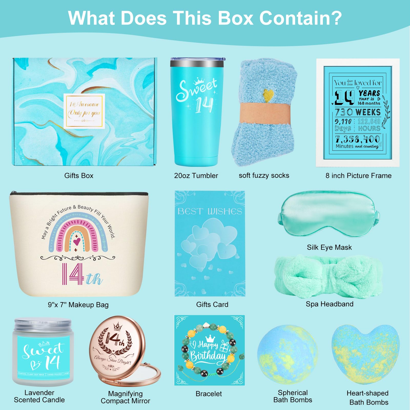 - BIRTHDAY GIFTS FOR 14 YEAR OLD GIRLS TRENDY 2025: The 14th birthday gifts for girls contains well-designed items to show your love and care,including 20oz tumbler, lavender scented candle,8 inch picture frame,mirror,cosmetic bag,spherical/heart shaped bath bombs,eye mask,spa headband,soft fuzzy socks,bracelet,gifts card and luxury gifts box. This bracelet makes a perfect sweet 14 birthday gifts for 14 year old girl, Legend has it that when the bracelet naturally falls off or wears out, the wish will come true.