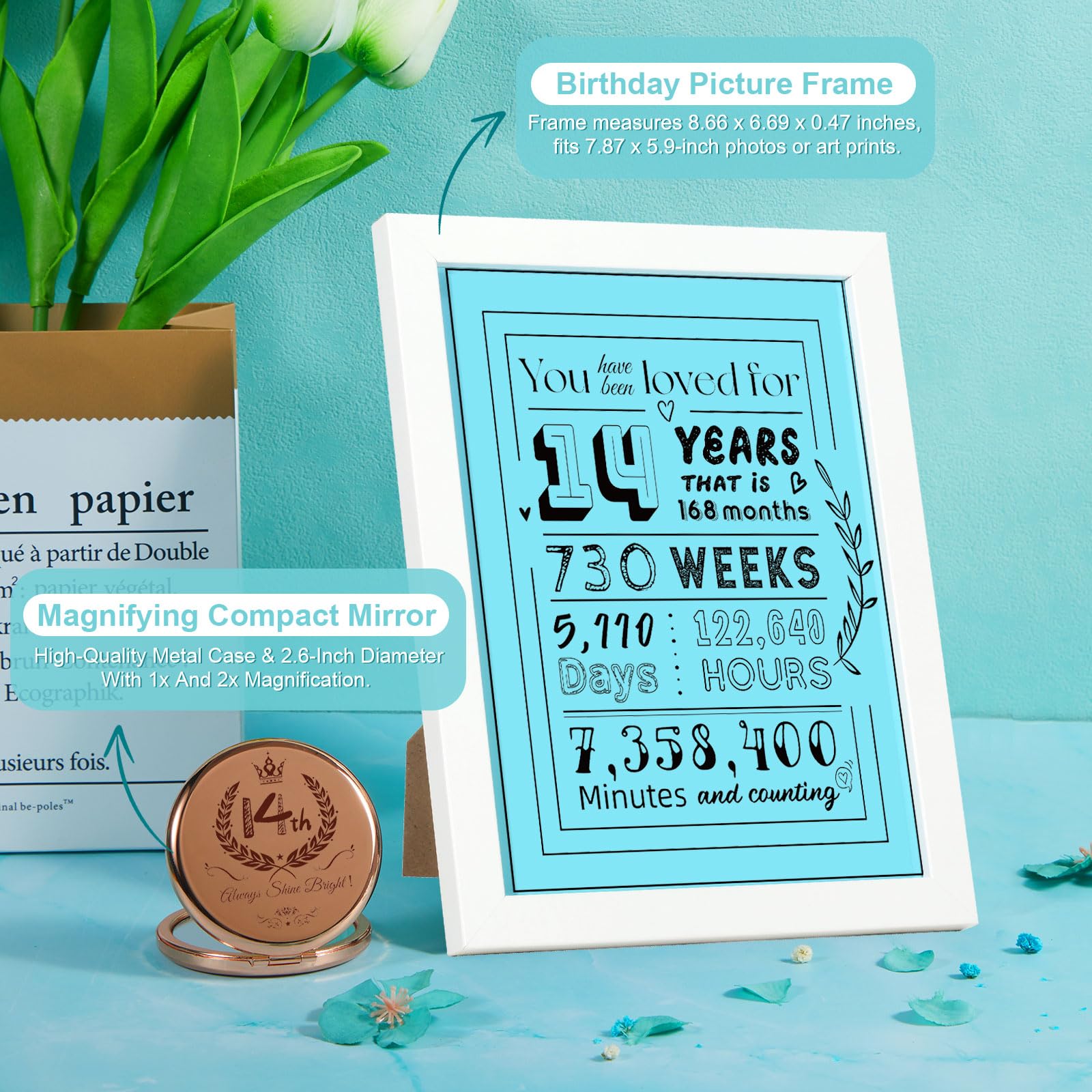 - EASTER GIFTS FOR 14 YEAR OLD GIRL: The 20oz tumbler printed with”Sweet 14”, wishing her joy every single day ahead.Magnifying compact mirror with 1x and 2x magnification,printing “14th&always shine bright” Serves as a reminder for her to maintain a positive attitude and stand out. 8-inch picture frame printed with “14 years,168 months,730 weeks...” Serves as a reminder for her to reflect on the passage of time and the preciousness of life,encouraging her to cherish each day ahead.