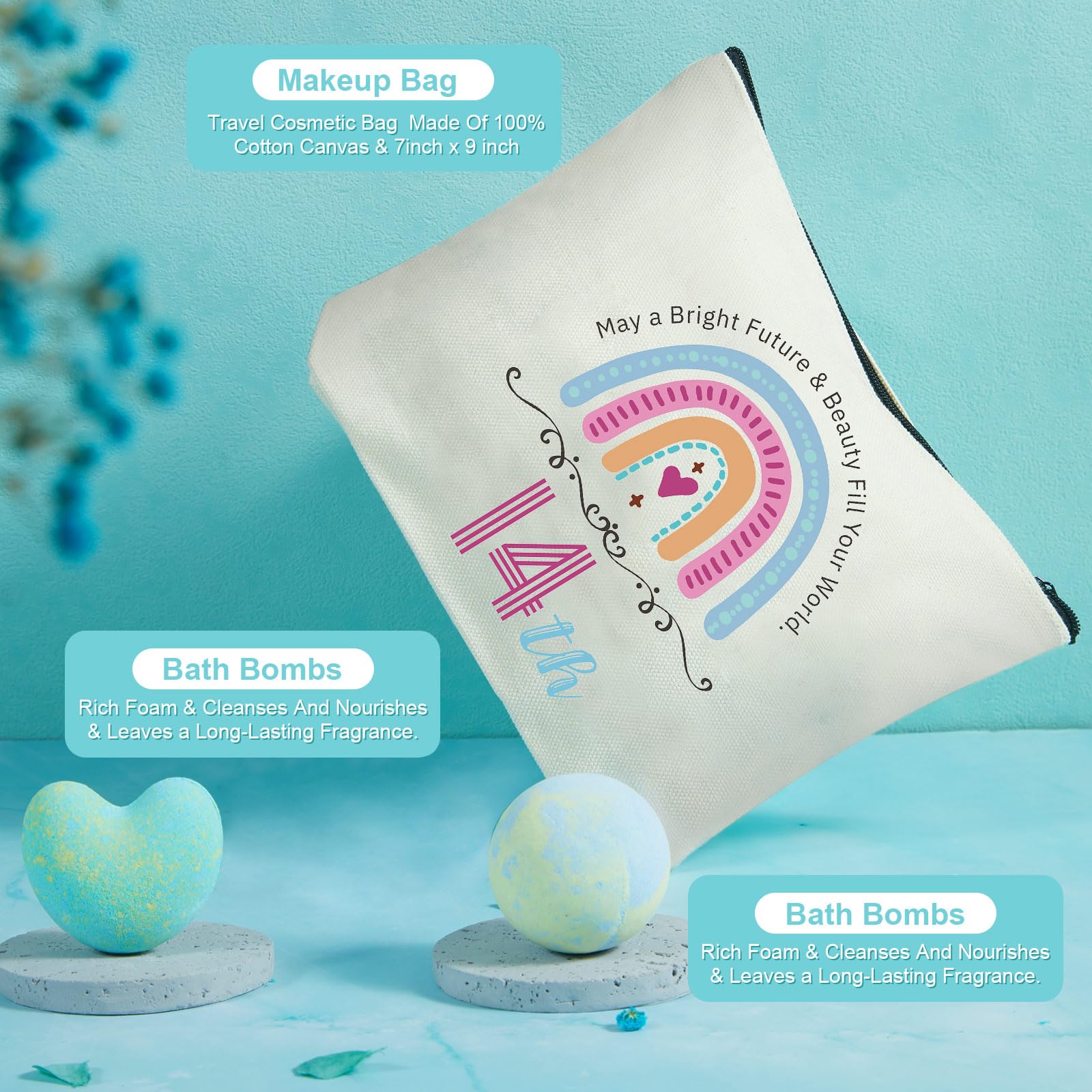 - COOL GIFTS FOR 14 YEAR OLD GIRLS: The cosmetic bag with "14th & may a bright future & beauty...", inspires confidence as she faces the future. The lavender-scented candle creates a calming atmosphere, while the spherical and heart-shaped bath bombs provide a soothing spa experience. The soft spa headband, plush heart-shaped socks, and silk eye mask ensure comfort and relaxation. Each item supports her well-being, nurturing her self-love and encouraging her to embrace relaxation and peace. Perfect for unwinding after a busy day.