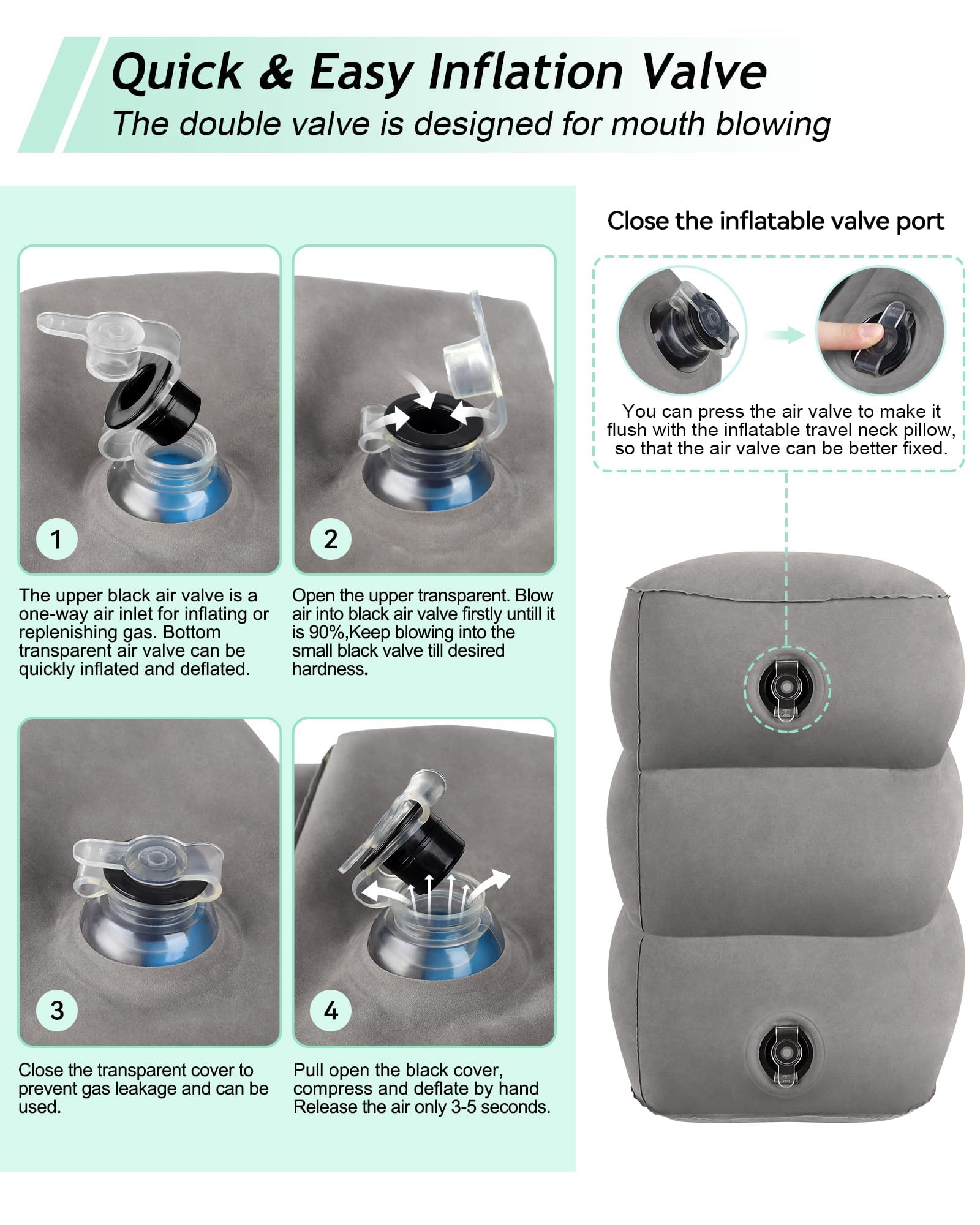 - ✈️UNIQUE HUMANIZED DESIGN: This inflatable leg rest has two separate air chambers. The lower chamber for 1-level height, and the upper chamber for 2-level height. With 2-in-1 double valve, the upper black air valve is a one-way air inlet for inflating or replenishing gas. Bottom transparent air valve can be quickly inflated and deflated. What's more, the double valve is designed for mouth blowing, It only takes about one or half minutes with a few breathes. Release the air only 3-5 seconds.
