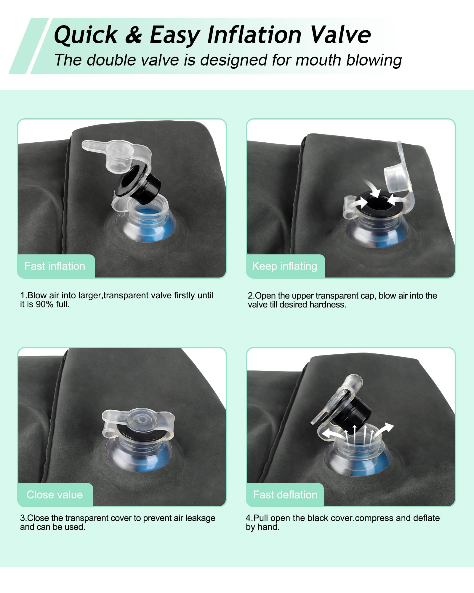 - UNIQUE HUMANIZED DESIGN: This inflatable leg rest has two separate air chambers. The lower chamber for 1 level height, and the upper chamber for 2 level height. With 2 in1 double valve, the upper black air valve is a one way air inlet for inflating or replenishing gas. Bottom transparent air valve can be quickly inflated and deflated. What's more, the double valve is designed for mouth blowing, It only takes about one or half minutes with a few breathes. Release the air only 3or 5 seconds.
