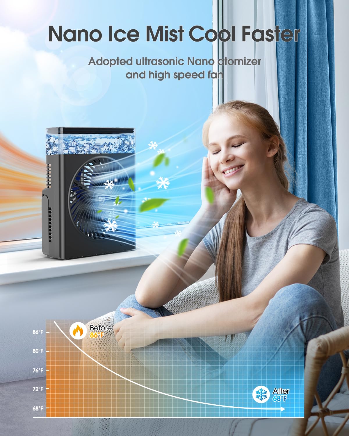 - ❄️【Mist Magic, Beat Heat!】- Our misting fan spray cooling mist on your surroundings to quickly remove your heat while further reducing the temperature of the surrounding air to ensure your maximum comfort, creating a cooling oasis wherever you go! Say goodbye to sweltering heat and hello to instant refreshmen!