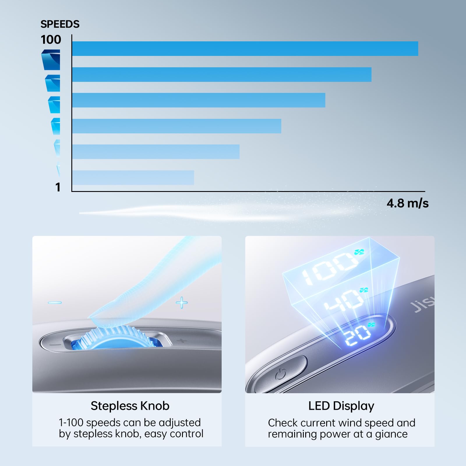 - 100 Adjustable Speeds: The bladeless neck fan has two high-performance motors that make the wind powerful, with a maximum speed of 8700 rpm, it can be adjusted from 1 to 100 by stepless knob to meet your different needs for instant cooling