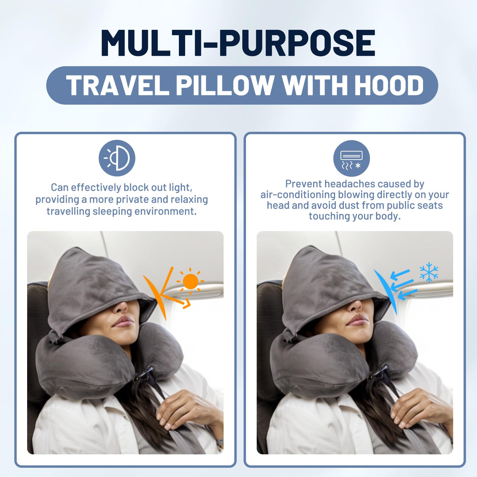 - đ¤MULTIFUNCTIONAL TRAVEL PILLOW WITH HOOD - This neck pillow features a unique hooded design that blocks out light for a more private and relaxing travelling sleep environment. In addition, the hood prevents cold air conditioning air from blowing directly on your head, avoiding your neck and head from getting cold, and isolating your face and head from dust from public seating. It is the best travelling essentials and gifts.