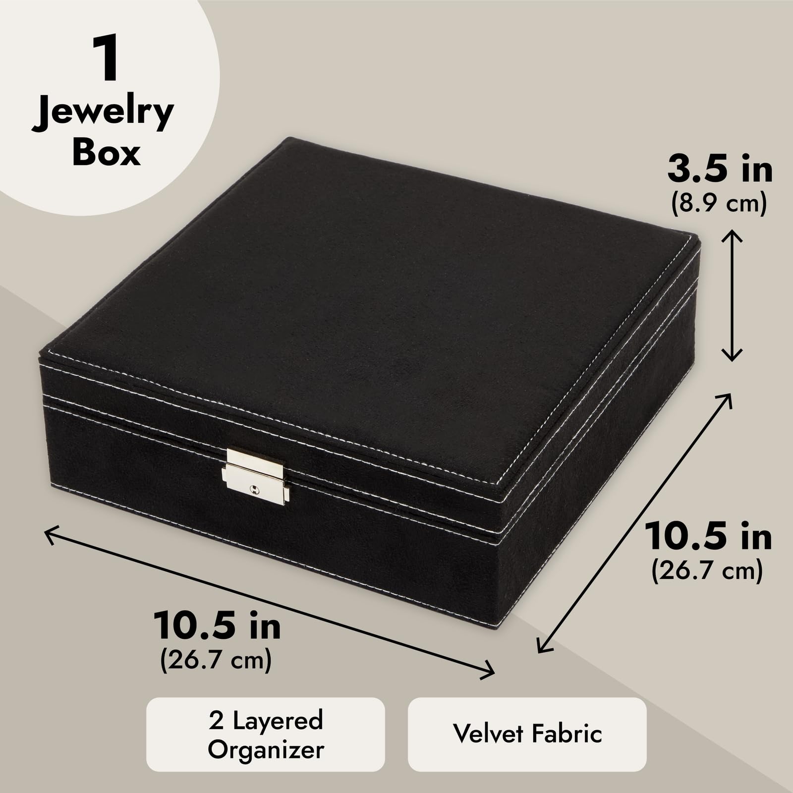Juvale Jewelry Box for Men - 10.5 x 10.5 x 3.5 in, Black Velvet - Locking 2-Layer Travel Jewelry Organizer & Earring Holder, Necklace Organizer & Decorative Tray