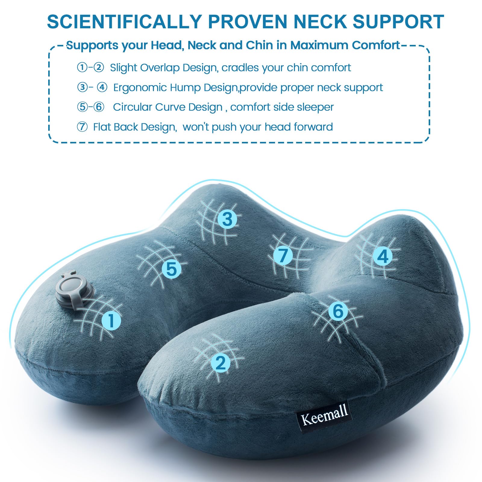 - Ergonomic Support: Inflatable travel pillows are specifically designed to provide adequate support to the neck and head while resting or sleeping during travel. SCIENTIFIC DESIGN that helps maintain proper alignment and reduce strain on the neck and shoulders.They can provide comfort and support during flights, train rides, road trips, office or even when camping or lounging by the beach.