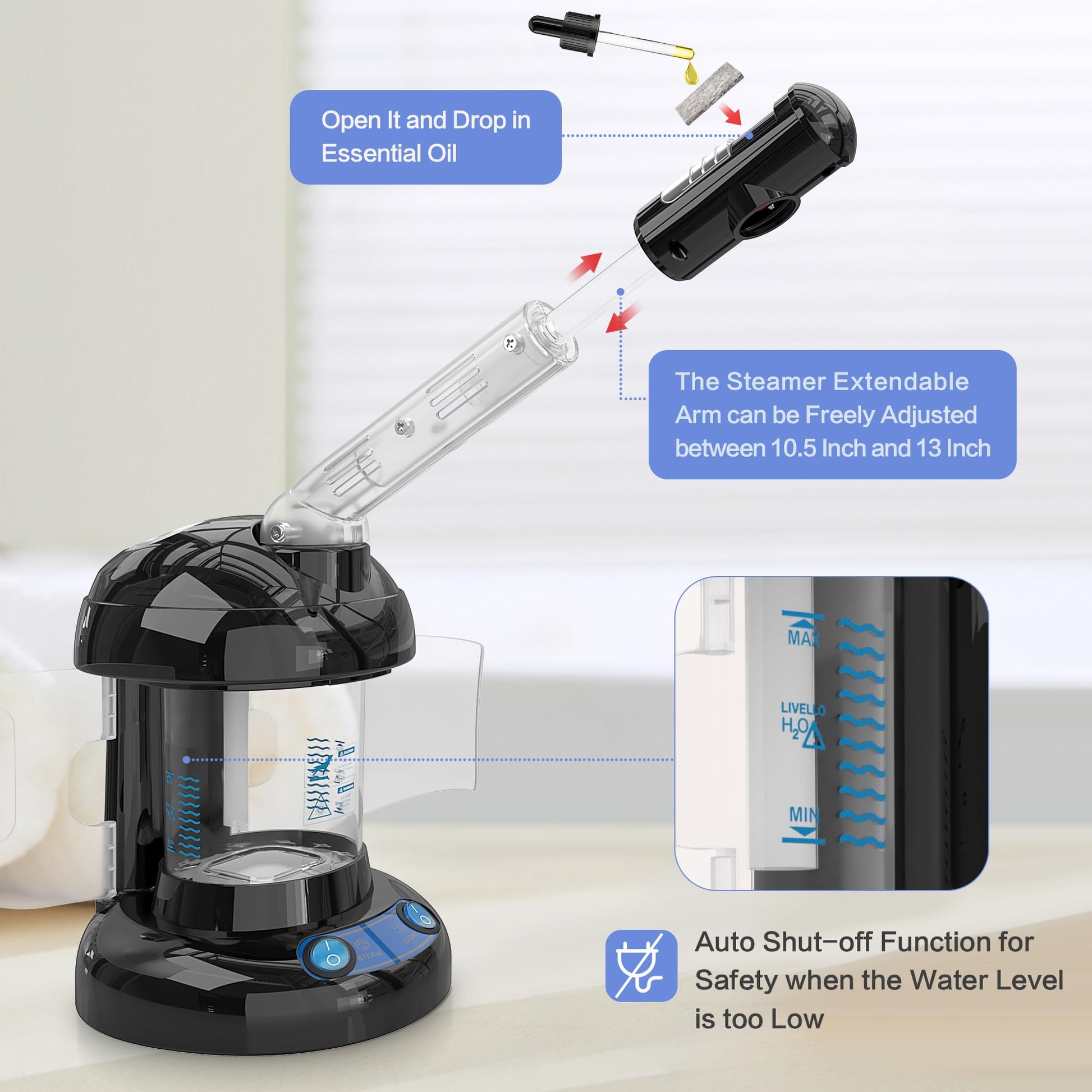 - Essential Oil Steamer: Aromatherapy diffusing function is provided. Skin can feel and absorb the fragrance and essence through this special steaming. Absolutely the steam is also a potential humidifier