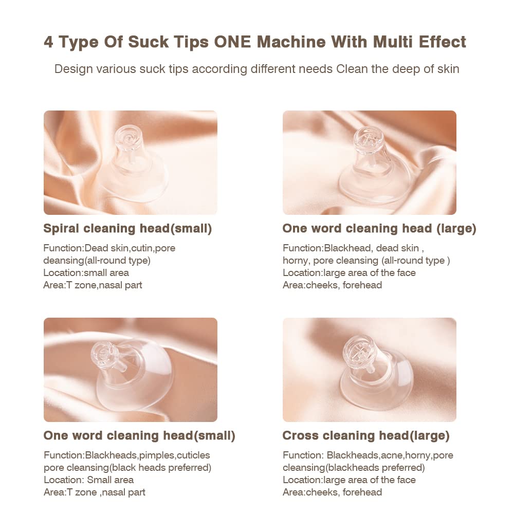 - MULTI-FUNCTION DESIGN: Includes 4 specialized suction heads for different areas - spiral head for T-zone, large cleaning head for cheeks, small head for nose, and cross head for overall face