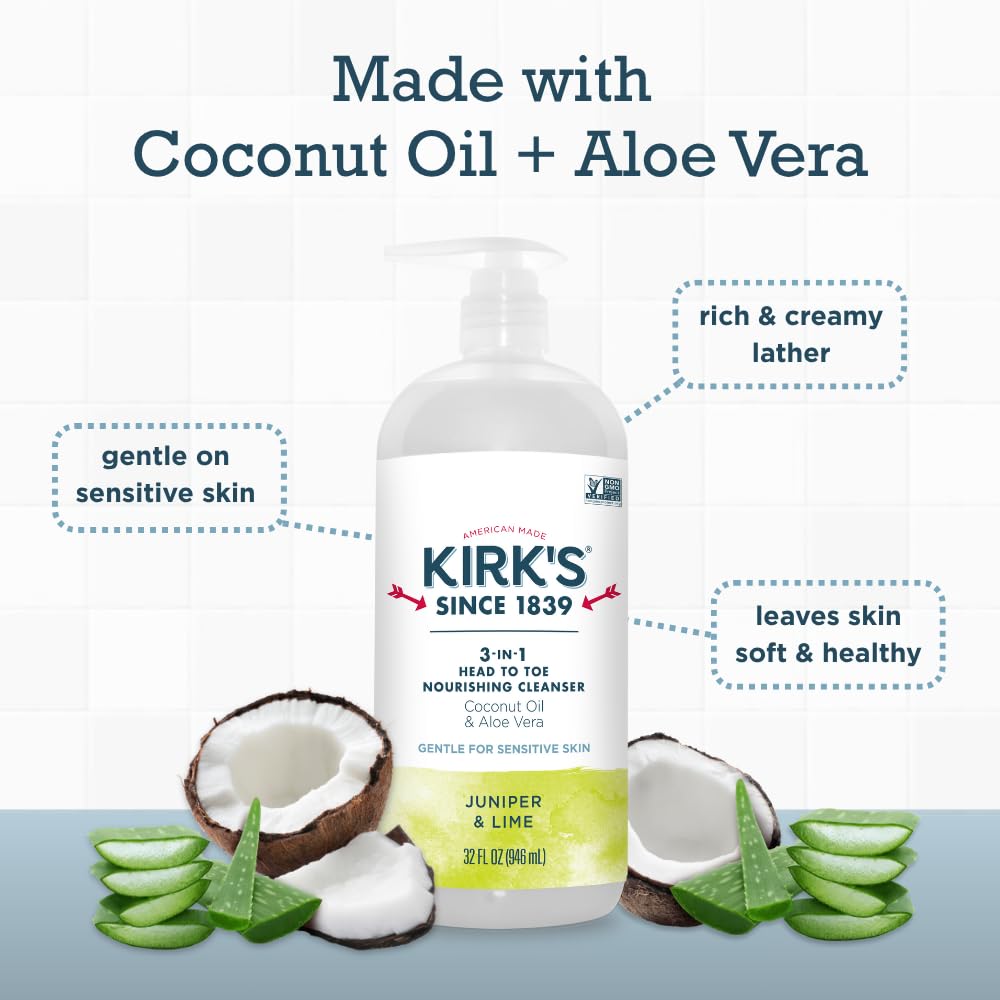 - 3-in-1 NOURISHING CLEANSER Simplify your daily routine with our Juniper & Lime Scent all-in-one shampoo, facial cleanser, and body wash! Smooth and soothe dry, irritated skin, and enjoy head-to-toe moisturizing with our antioxidant-rich coconut oil soap. Includes bonus travel-size Original Fresh Scent Castile Bar Soap which creates a gentle and creamy lather leaving skin feeling soft and healthy.