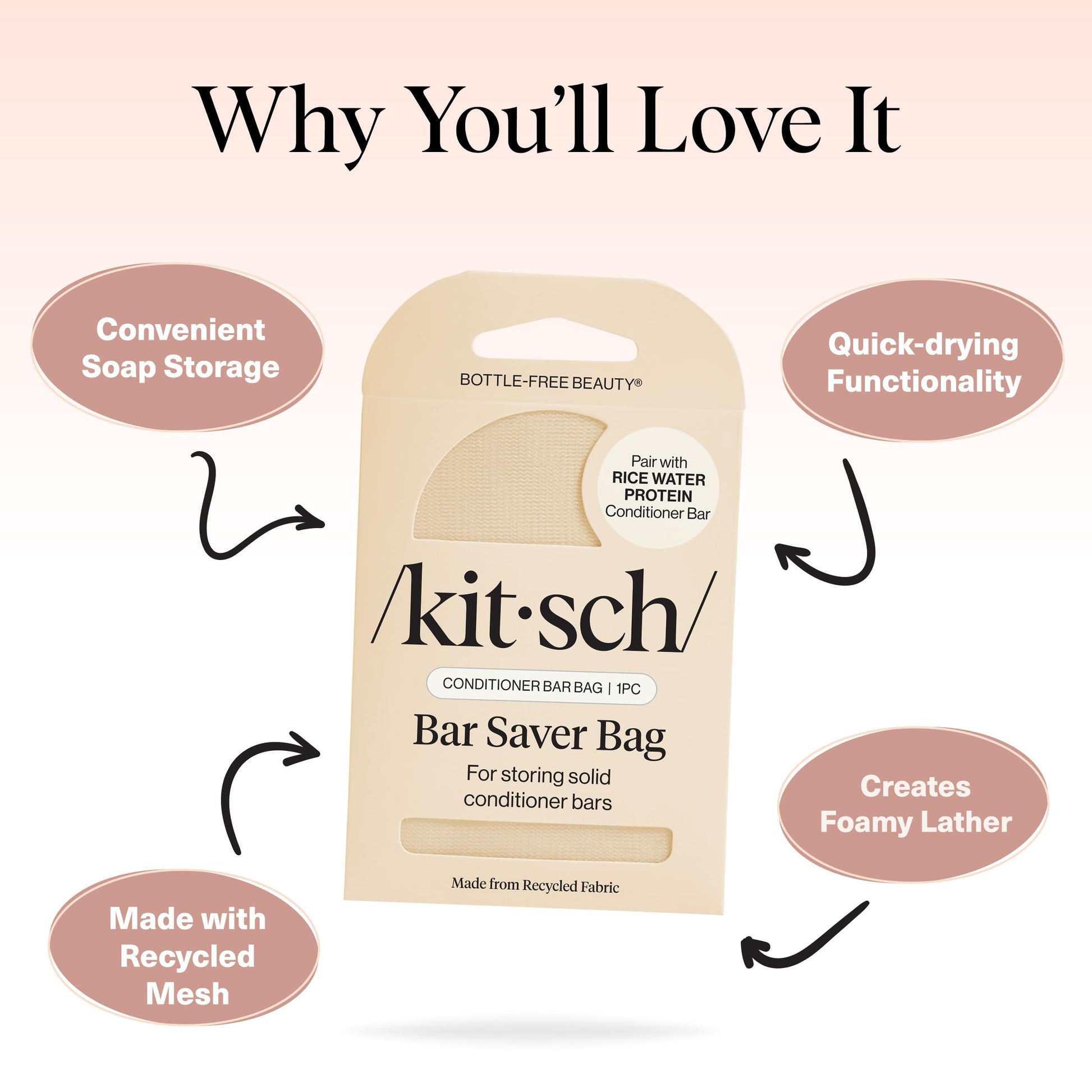 Kitsch Bar Soap Saver Bag - Patented Mesh Bag Soap Holder for Rice Water Protein Conditioner Bar With Tag Identifier - Extends Use & Prevents Soggy Mess - Recycled Mesh Beauty Pouch, Eco-Friendly