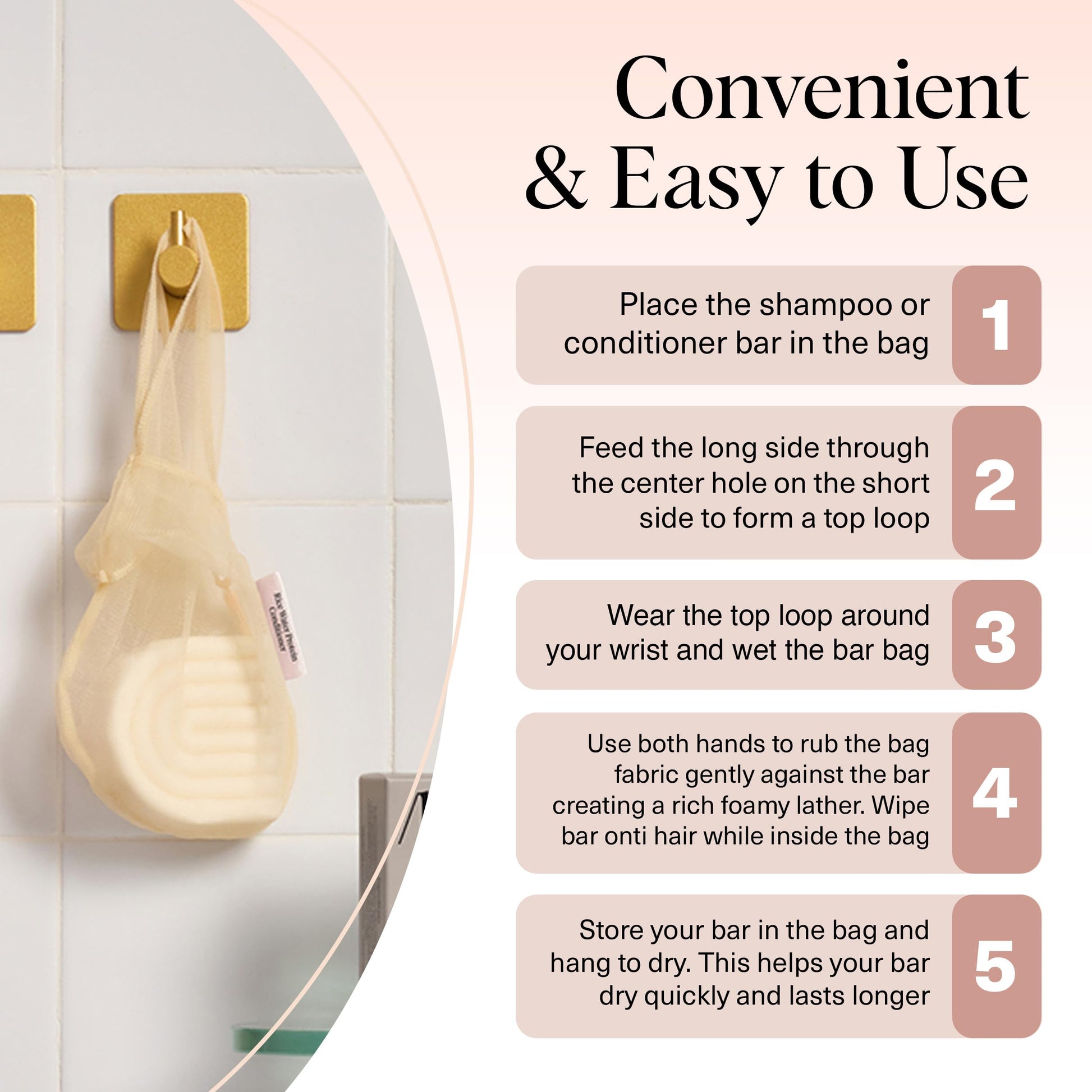 - REDUCE PLASTIC WASTE WITH BOTTLE-FREE BEAUTY – Replace single-use bottles with our sustainable soap saver bag and bar soap holder for shower. Perfect for body wash bars, shampoo bars, and conditioner bars, this eco-friendly option helps reduce plastic waste while keeping your routine stylish and efficient.