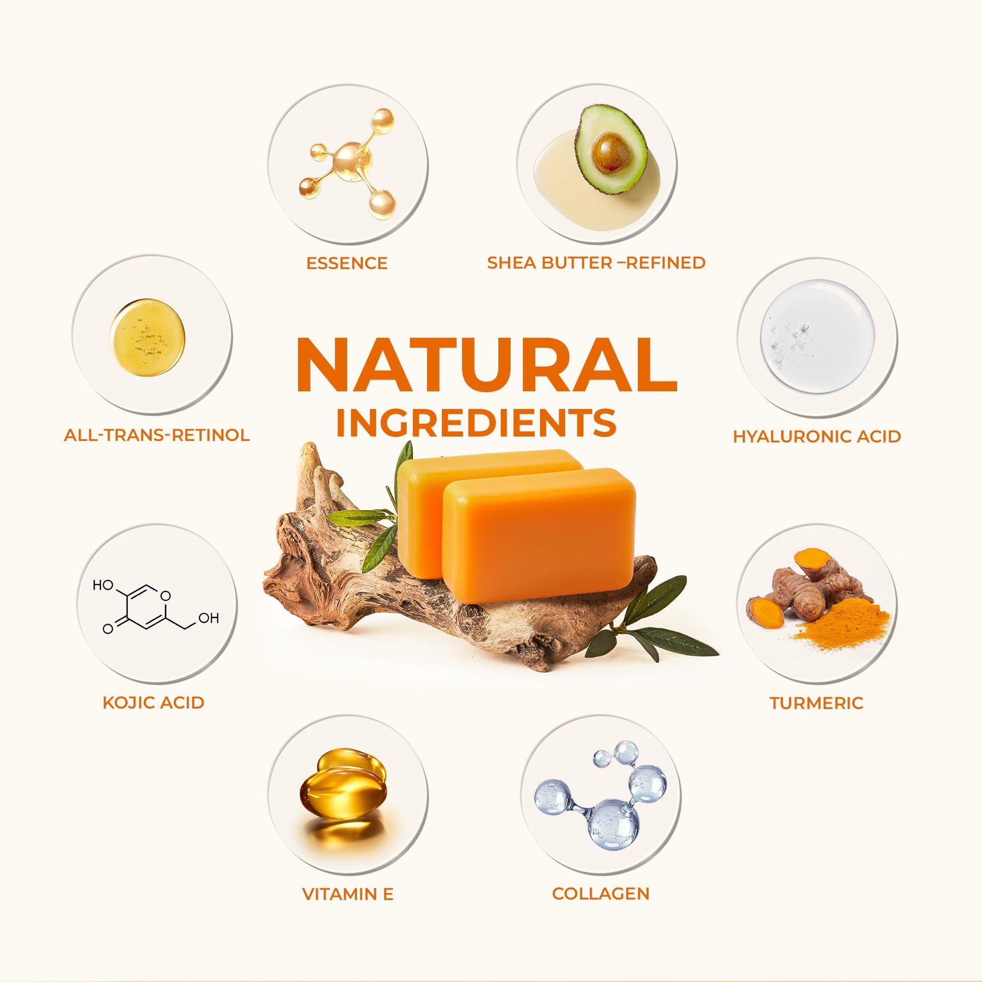 - Hydration & Skin Rejuvenation – Vitamin E, Retinol & Collagen Blend Enriched with Collagen, Retinol, and Vitamin E, our turmeric kojic acid soap deeply hydrates your skin while minimizing sun damage, blemishes, and fine lines—revealing smoother, softer, and youthful-looking skin.