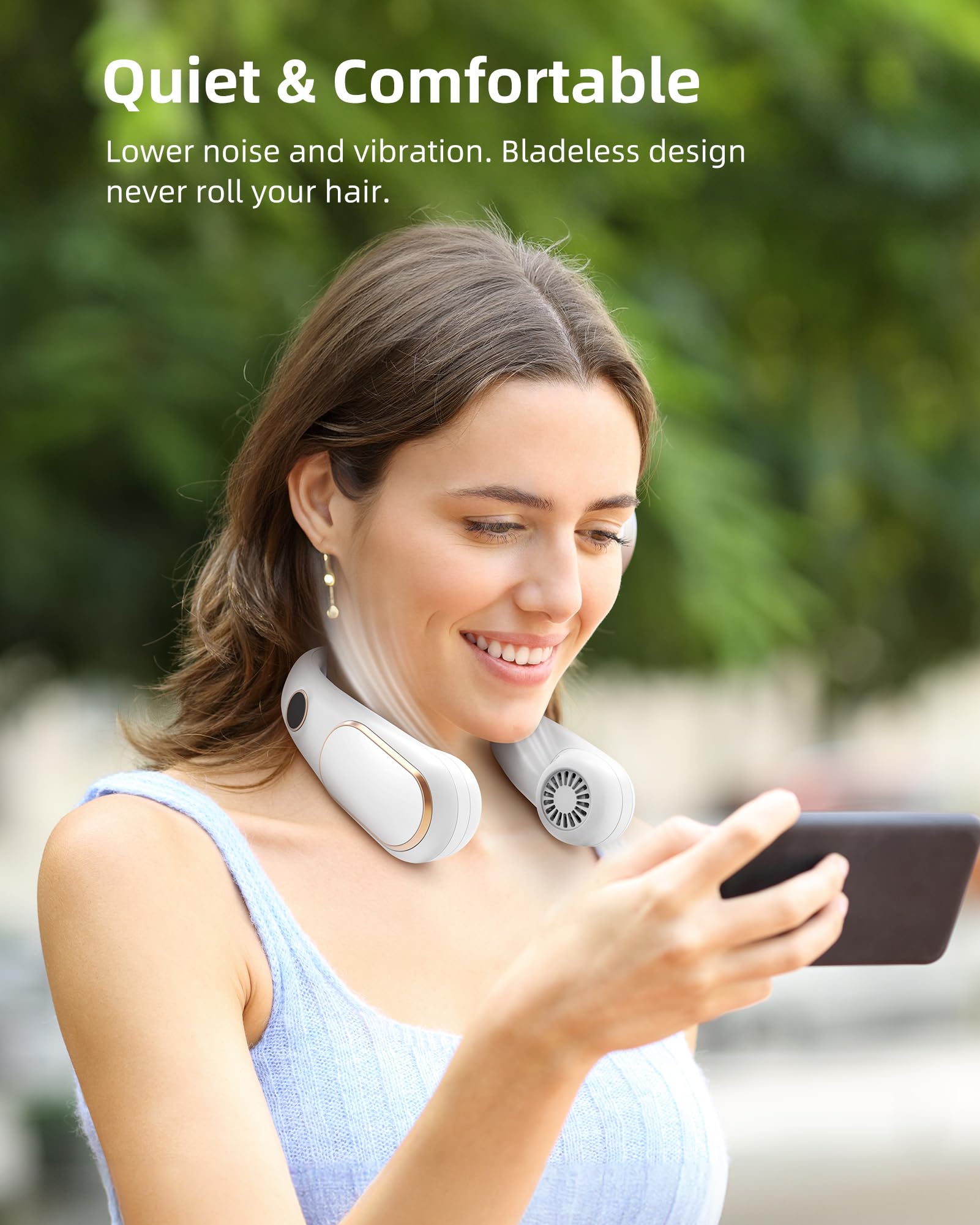 - Outdoor & Indoor Use: The neck fans portable rechargeable is suitable for personal cooling for outdoor activities, such as camping, BBQ, traveling, hiking, climbing and watching sports games, golf, mowing lawn, yard work, stroller rides, wondering around, etc, and for indoor activities, such as cooking in the kitchen, painting, reading, working in the office, exercising in the gym, etc