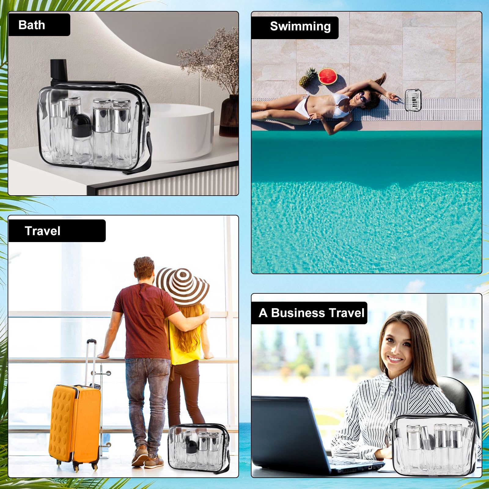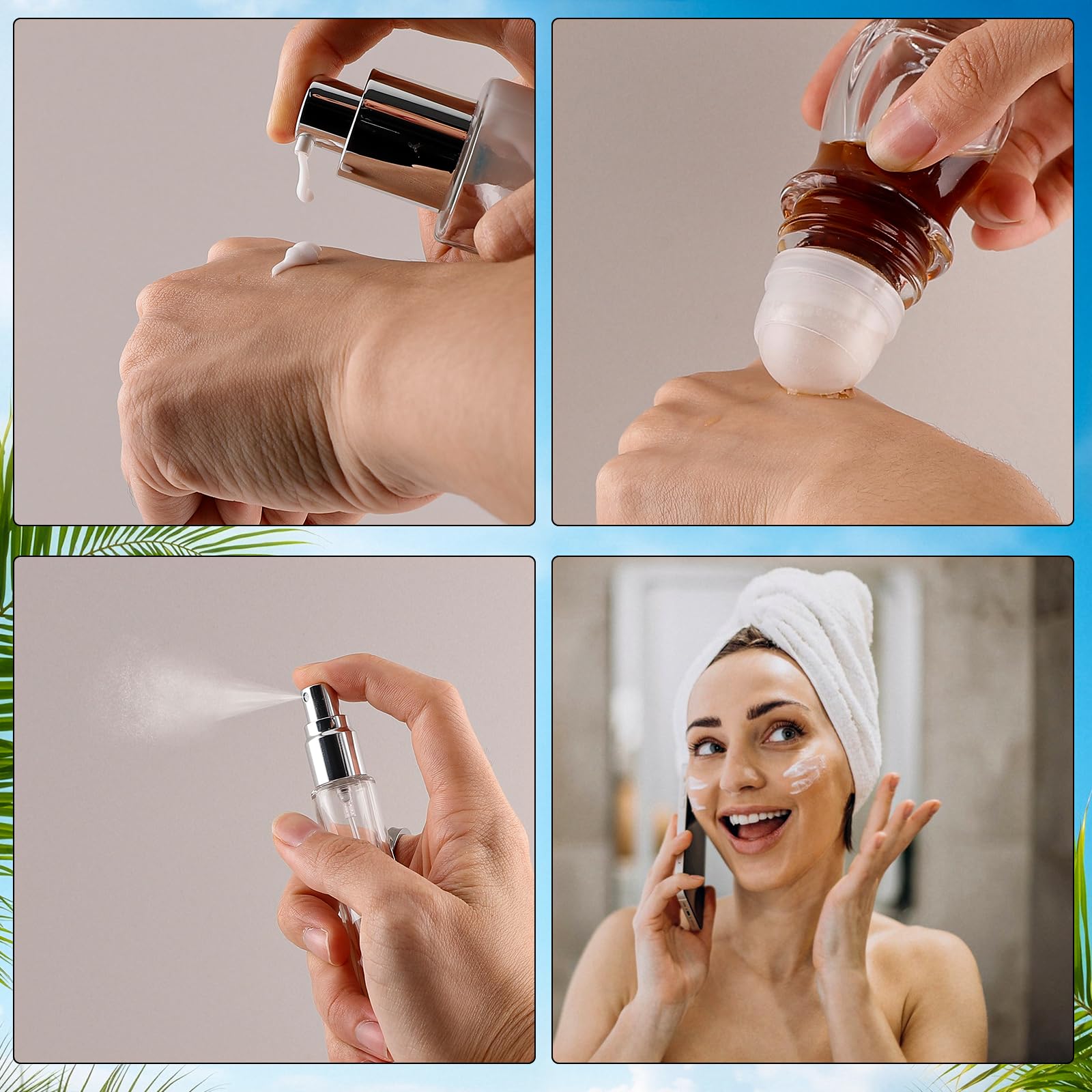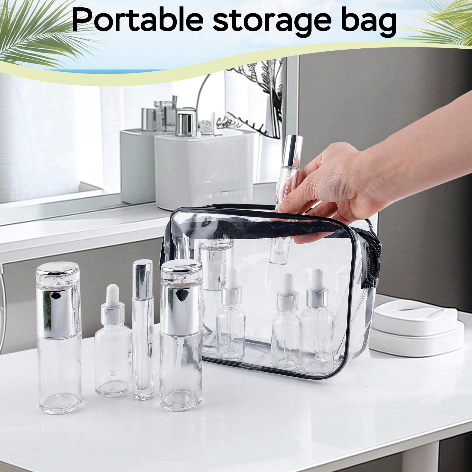 - Package Includes: You will receive a total pieces of 34 skincare travel containers, including 2 lotion bottles, 2 spray bottles, 4 cream cans, 4 glass dropper bottles, 1 essential oil bottle, 2 ball bearing glass bottles, 2 transparent spray bottles,2 TSA-approved clear travel bag and Handy tools. Please check the package contents when receiving the package, enough to meet your business travel needs