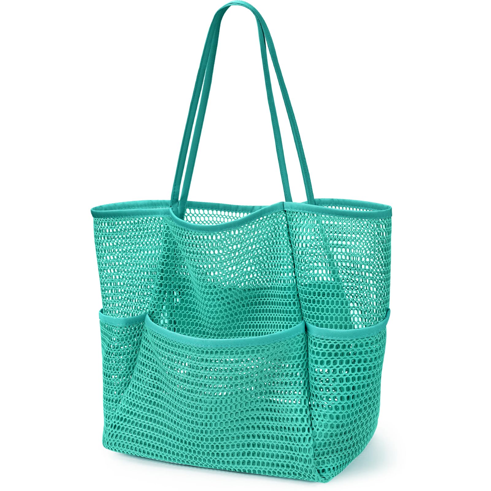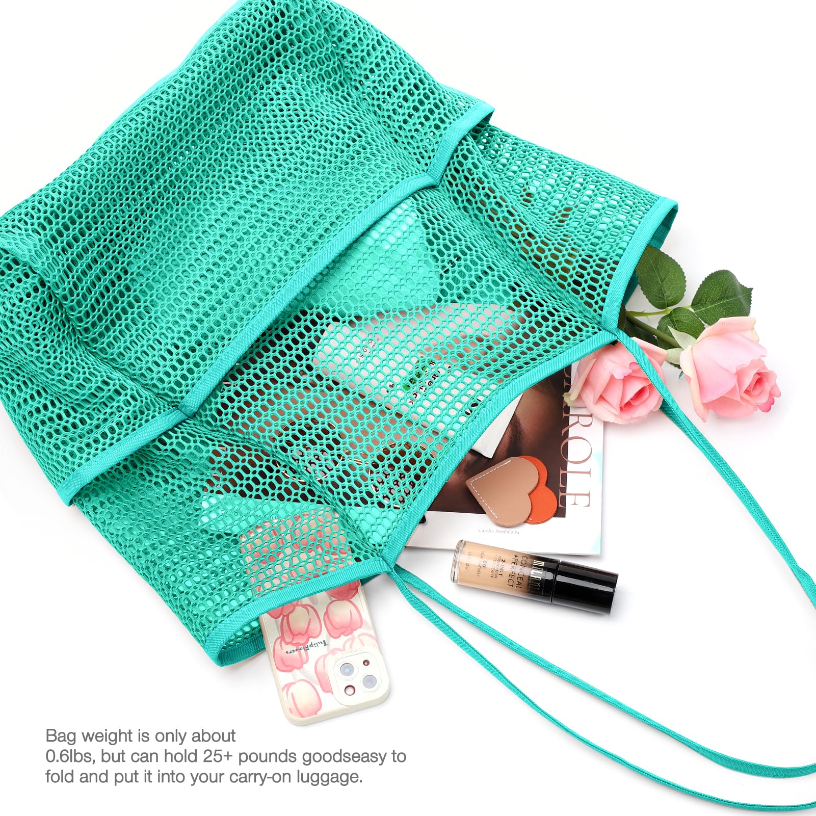 KPX Beach Bag with Mini Pocket, Beach Tote Bags for Women Large Foldable Mesh Swimming Pool Travel Bags - Sandproof (Teal)