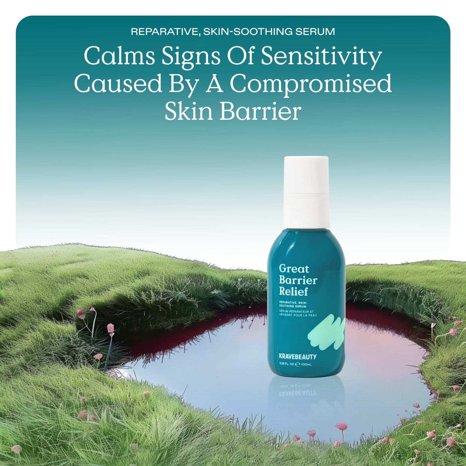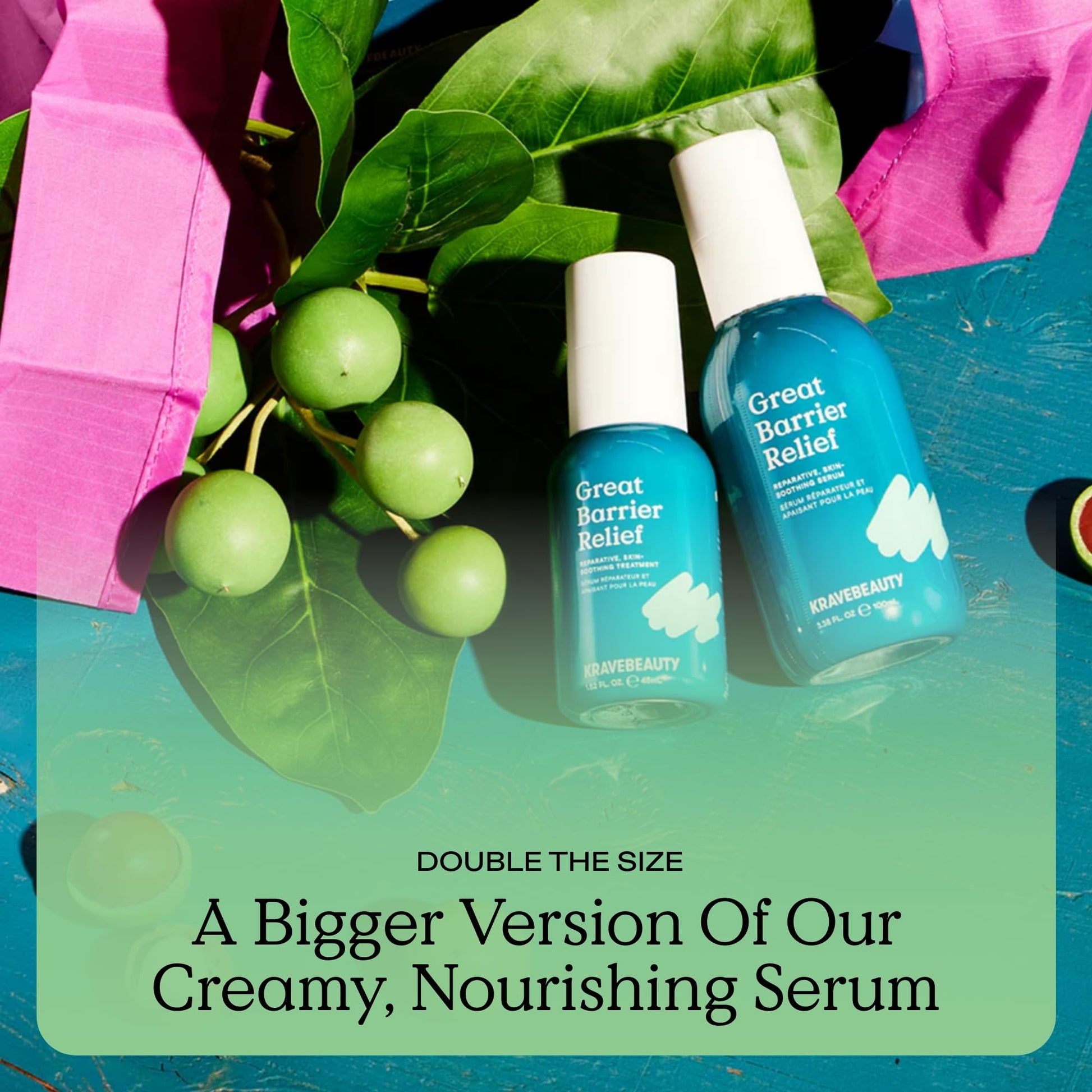 - SKIN SOOTHING SERUM - A bigger version of our creamy, nourishing serum that calms signs of sensitivity caused by a compromised skin barrier. With the same blend of nourishing oils + rebalancing actives, Jumbo Great Barrier Relief helps by gently hydrating the skin, soothing irritation, and strengthening the skin barrier just like it’s mini-me. Take the jump and soak up some extra relief!
