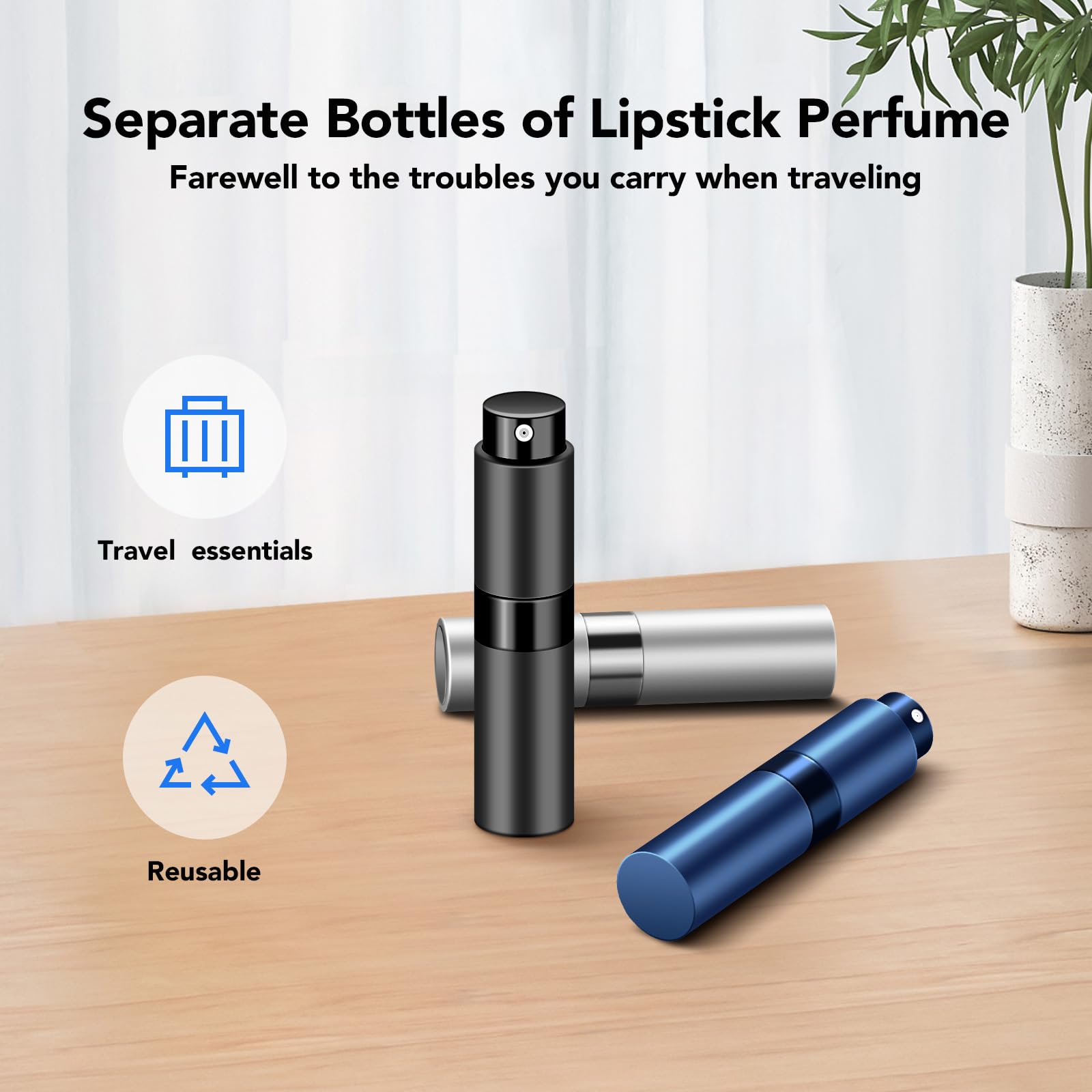 - 【Easy to Use】: mini perfume refillable bottle like a lipstick tube, which is designed to rotate the bottle body, automatically eject the nozzle and automatically return to the original position. No additional steps are required to take off or cover the lid when using, making it easier and faster for you to use.