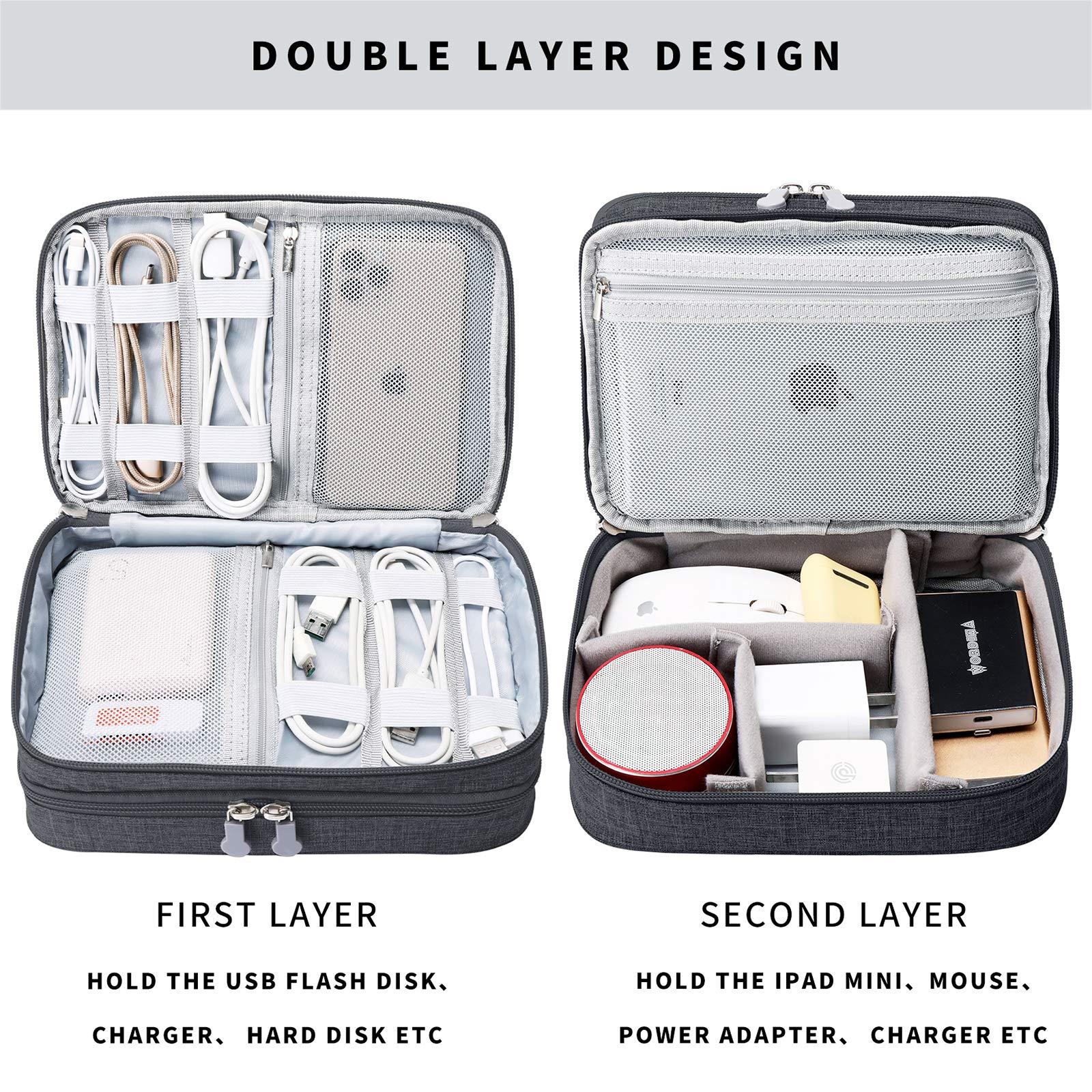 - 【DOUBLE LAYERS & WELL ORGANIZED】- This travel electronics organizer is designed with multiple pockets and various size of elastic bands providing great flexibility for organizing electronics accessories such as USB Cable Cord, Flash Drive, Wall Charger, SD Card, Hard Drive, Power Bank, Earbuds, Camera.A large zipper mesh pockets.