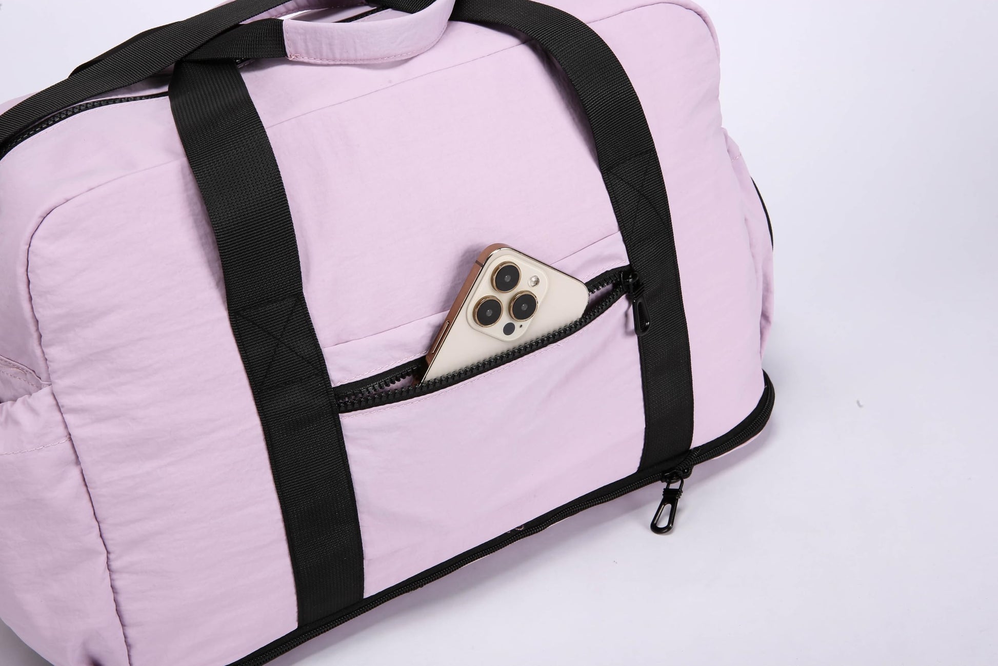 - Multi-Pocket Duffel Bag With Trolley Sleeve: The weekend bag has a large main bag, front zipper pocket, back zipper pocket, folded zipper pocket, two Inside patch pockets and a dry wet separation pocket. Fastening the overnight bag to your luggage with a trolley sleeve can effectively relieve the pressure on your shoulders, quite convenient for travel