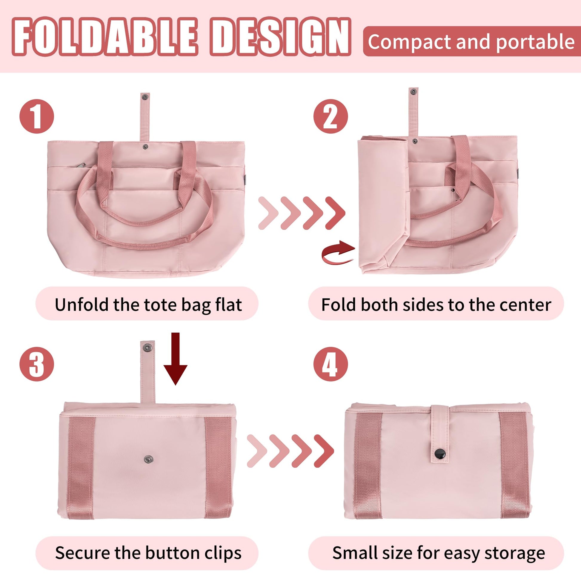 - Foldable Tote Bag: Folds up when not in use, folds into the perfect size for travel, lightweight and portable. It can be used as a mini storage bag and can be easily put into backpacks and suitcases to save space