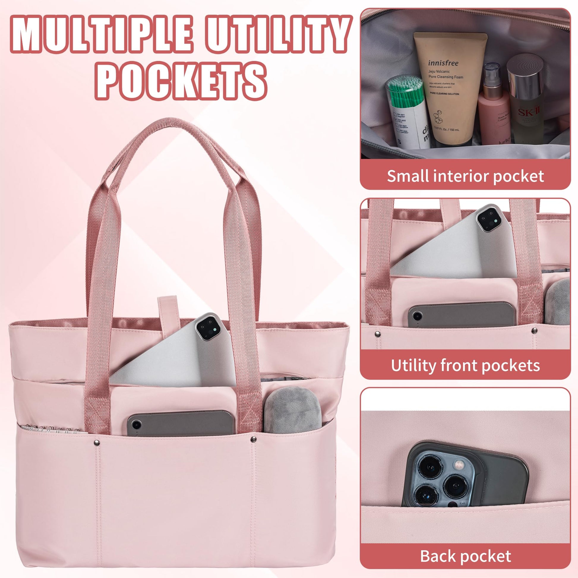 Large Tote Bag for Women with Multiple Pockets, Water Resistant Foldable Tote Bag Utility Tote, Lightweight Shoulder Bag Handbag for Travel, Work, Pink