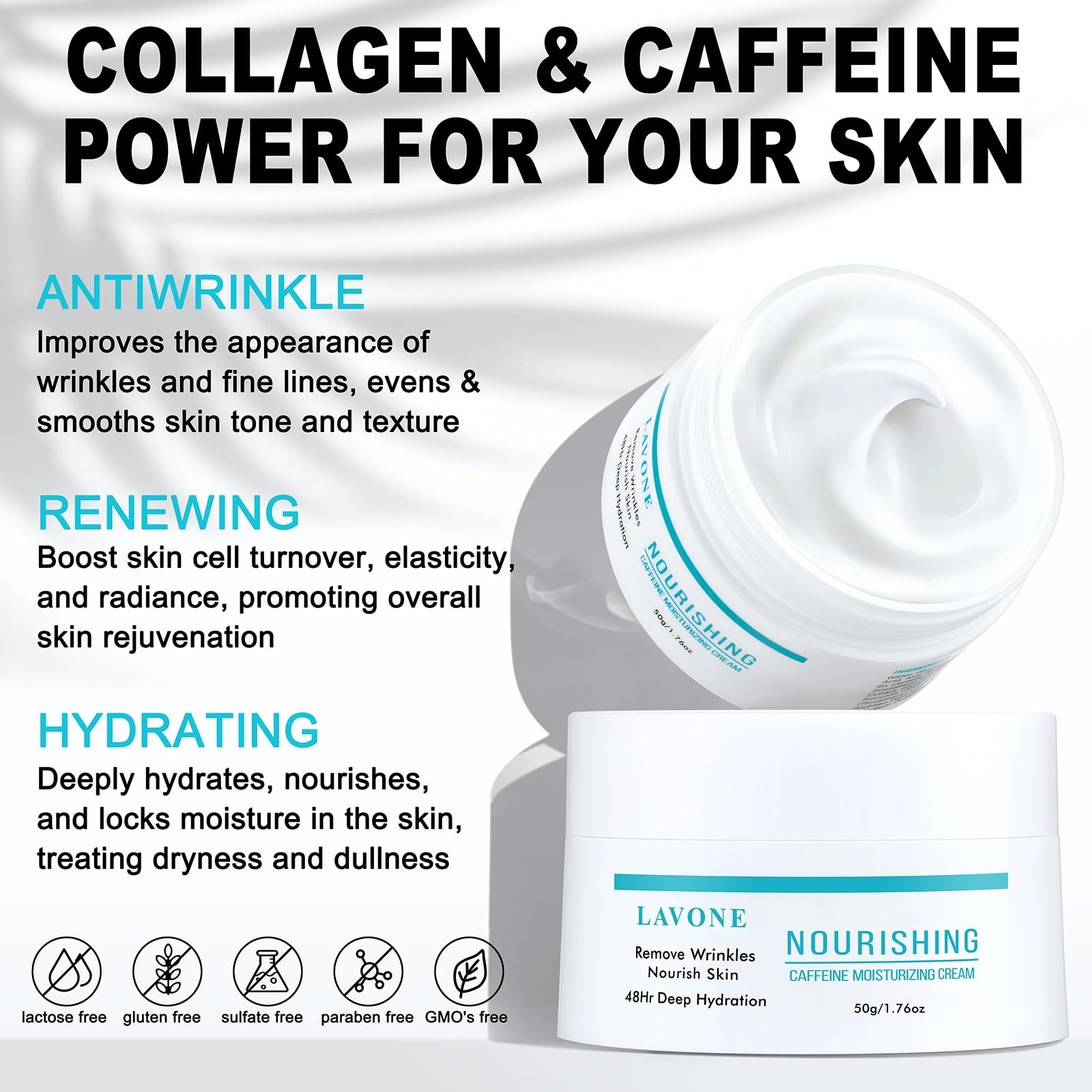 LAVONE Face Moisturizer Moisturizer Face Cream for Women and Men with Caffeine, Hyaluronic Acid, Vitamin E/C | Daily and Night Facial Moisturizer | For Dry, Oily, Sensitive, and Acne-Prone Skin