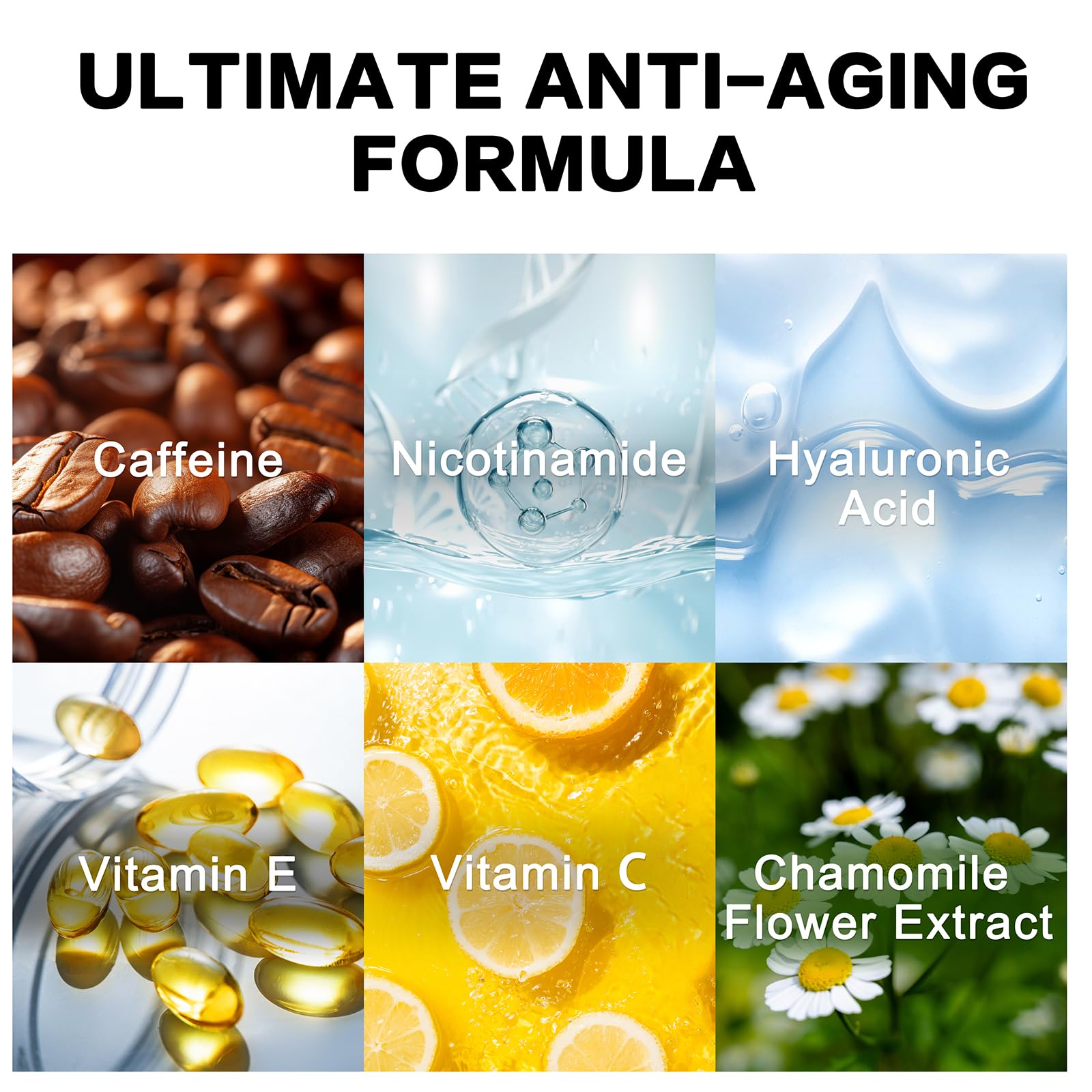 Anti-aging benefits with caffeine, vitamins E/C, and chamomile.