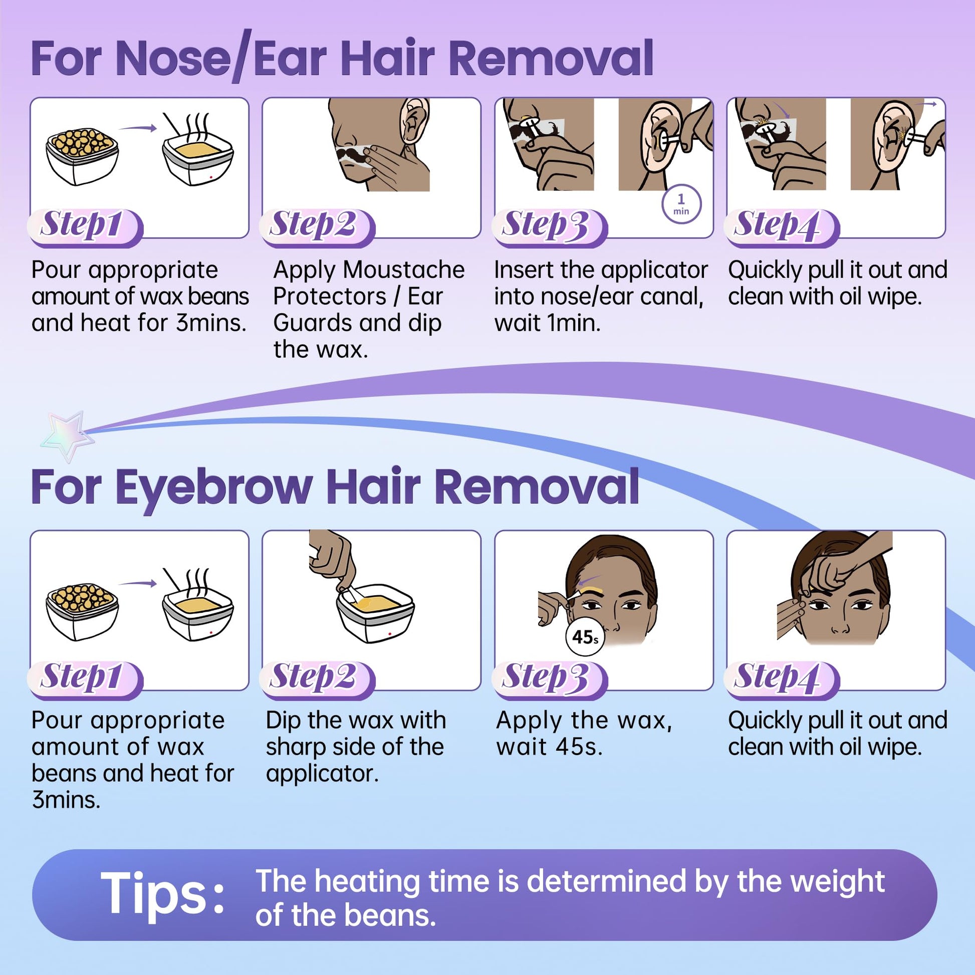- Comprehensive Kit for Total Convenience: This nose wax kit comes with everything you need for a complete grooming experience:100g honey-flavored wax beans,10 dual-head applicators for precise use,10 ear patches and 10 mustache patches for targeted facial hair removal,5 oil packs to soothe and nourish post-wax skin