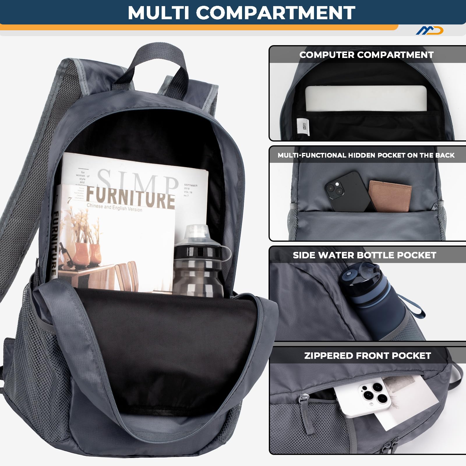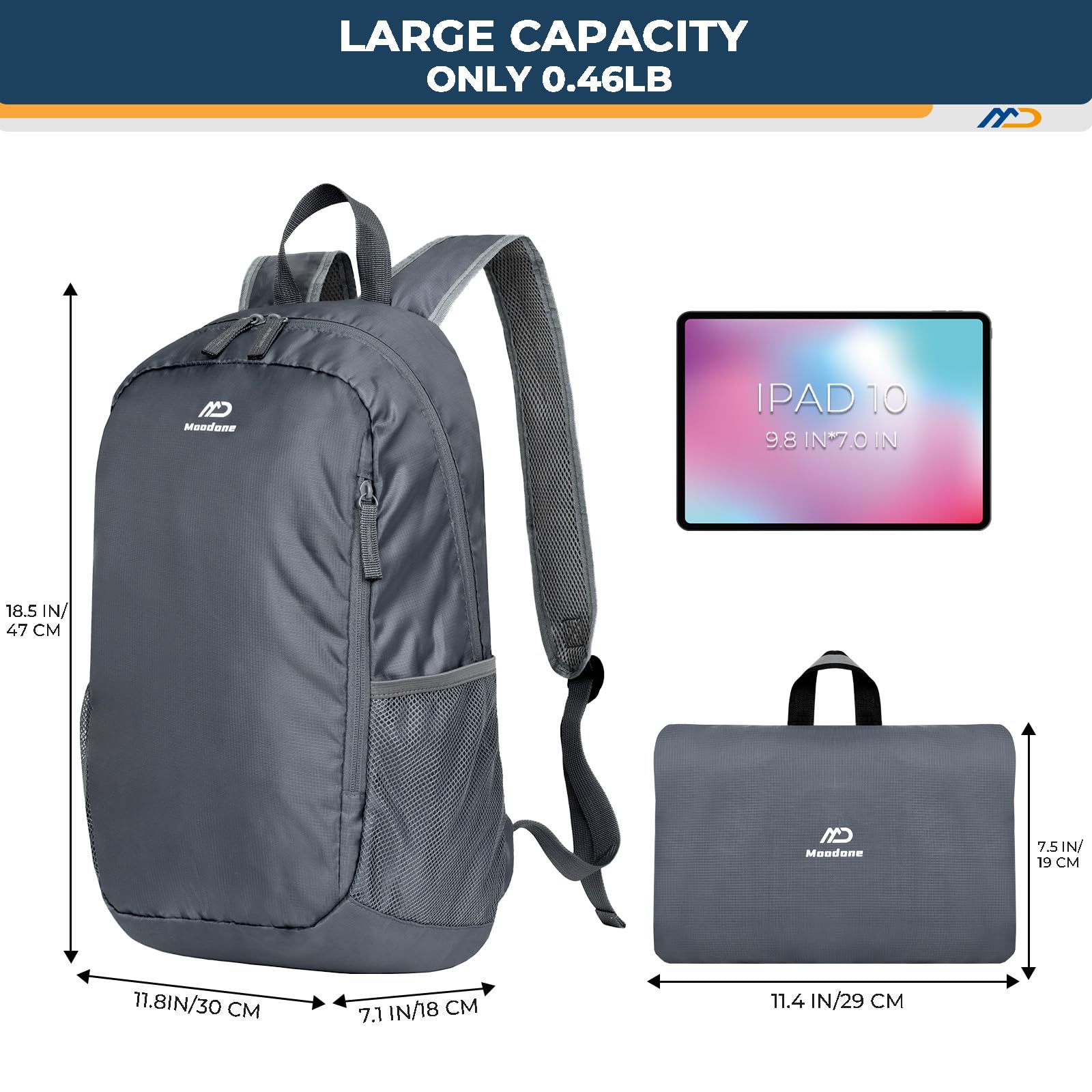- Large Capacity Can Fold The Light Backpack 30l:One front compartment holds your tissue key or earphone. One main compartment fits your travel essentials: such as clothes and Umbrella. Two side pockets keep your things organized and separated. This lightweight backpack is only 0.5lb, and is easy to carry and use