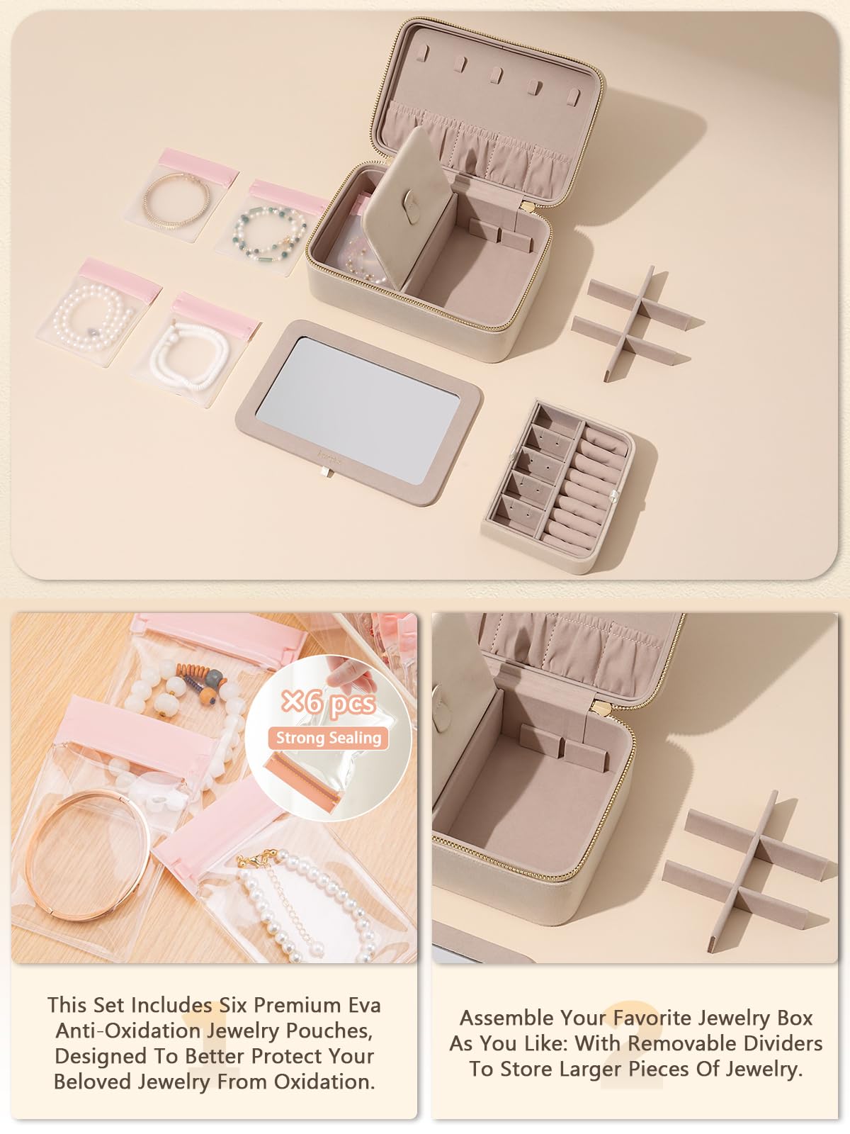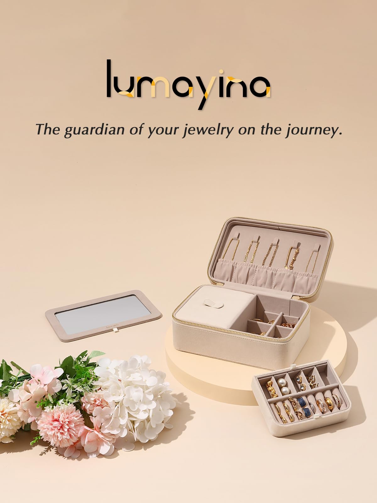 Lumayina Velvet Travel Jewelry Box with Large Mirror, Double-Layer Jewelry Organizer Case for Women and Girls, Portable Storage Case with 6 Anti-Tarnish Bags Gift Ready for Her (Beige)