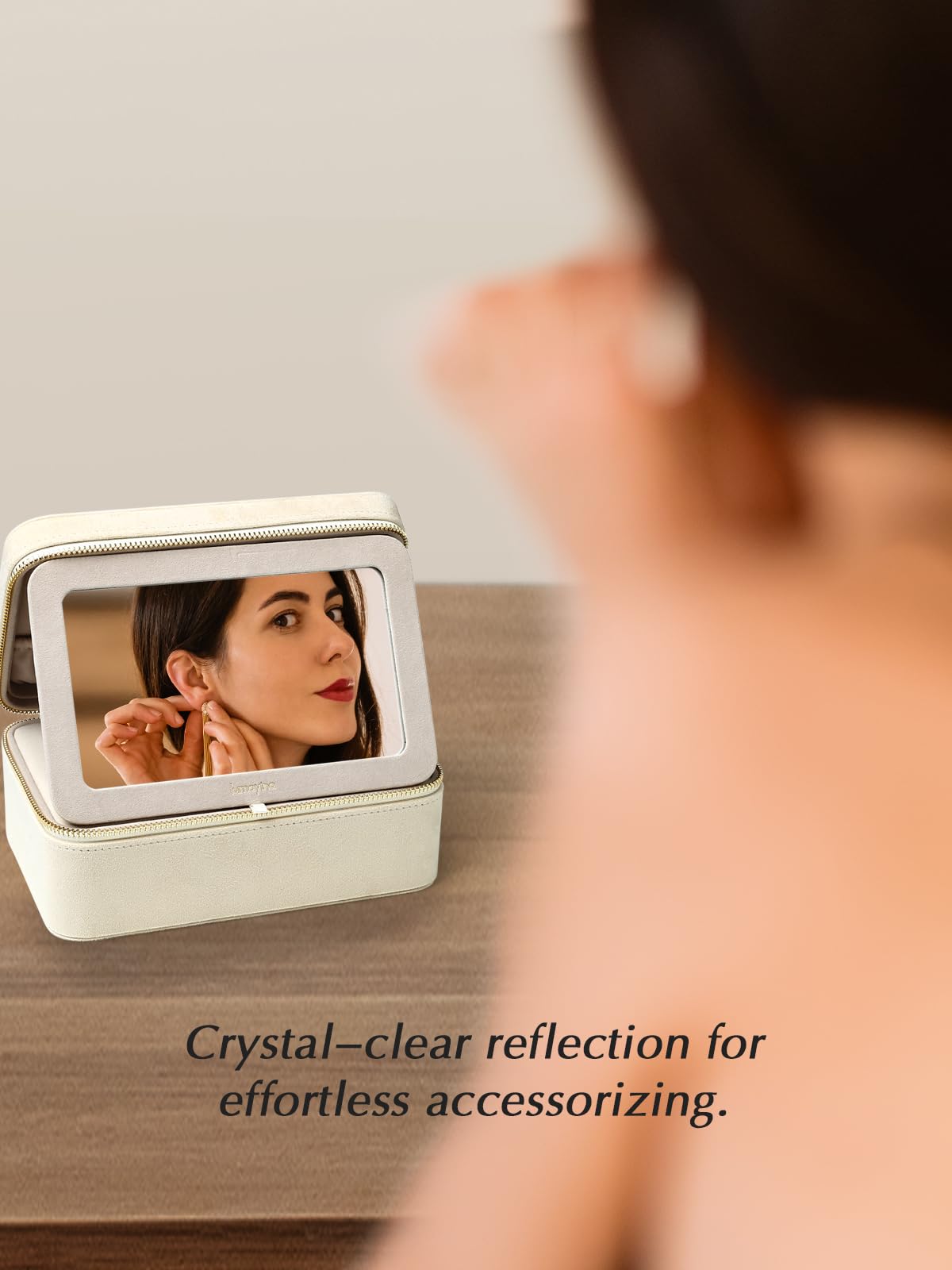 - [Smart Organization] A well-structured, dual-layer layout offers dedicated spaces for chains, necklaces, rings, hoop earrings, and bracelets while preventing tangling and misplacement. The top layer has necklace hooks, ring slots, and earring compartments, while the bottom has adjustable dividers for larger accessories. A built-in HD mirror provides a clear, distortion-free view and can be removed for standalone use, adding convenience for accessorizing anytime.