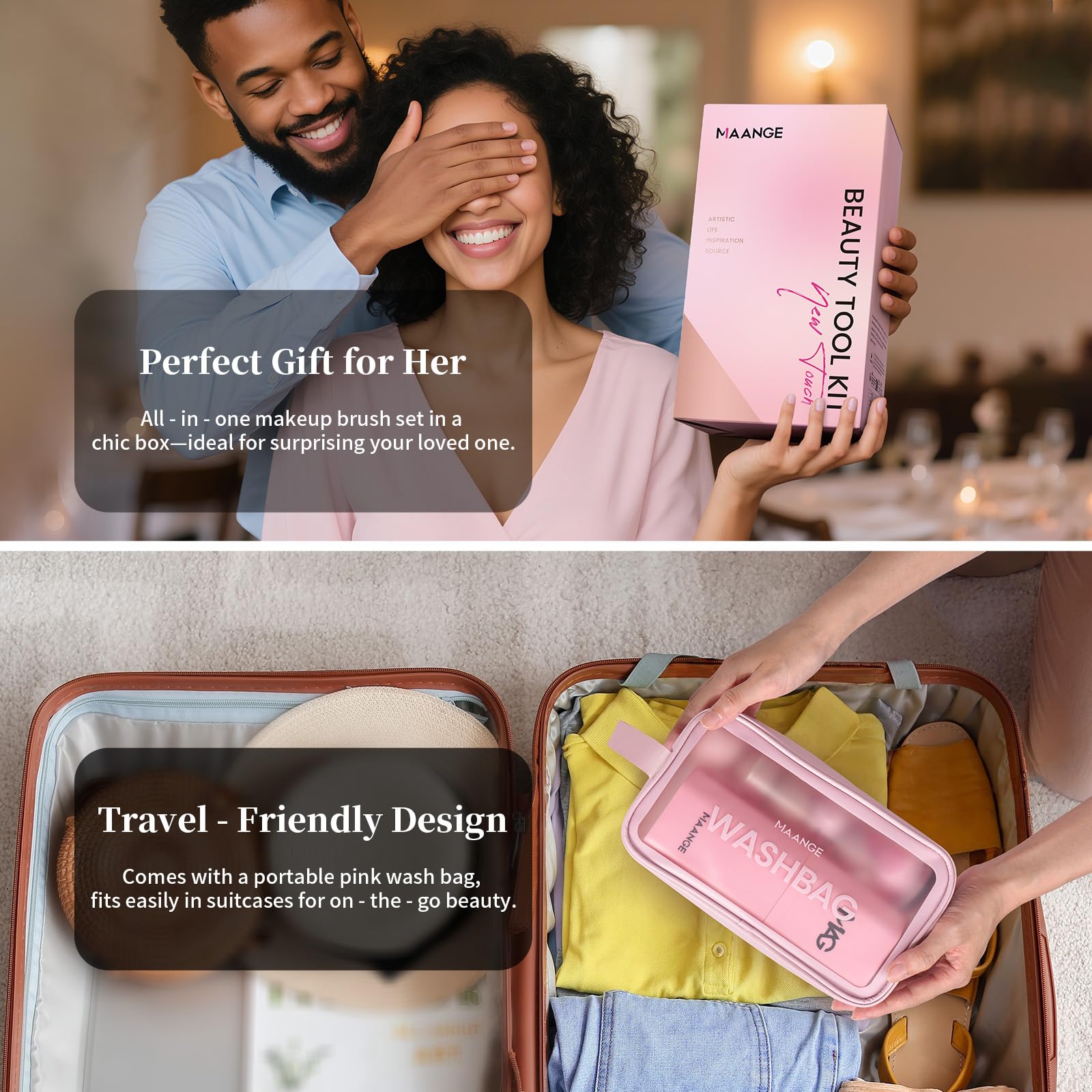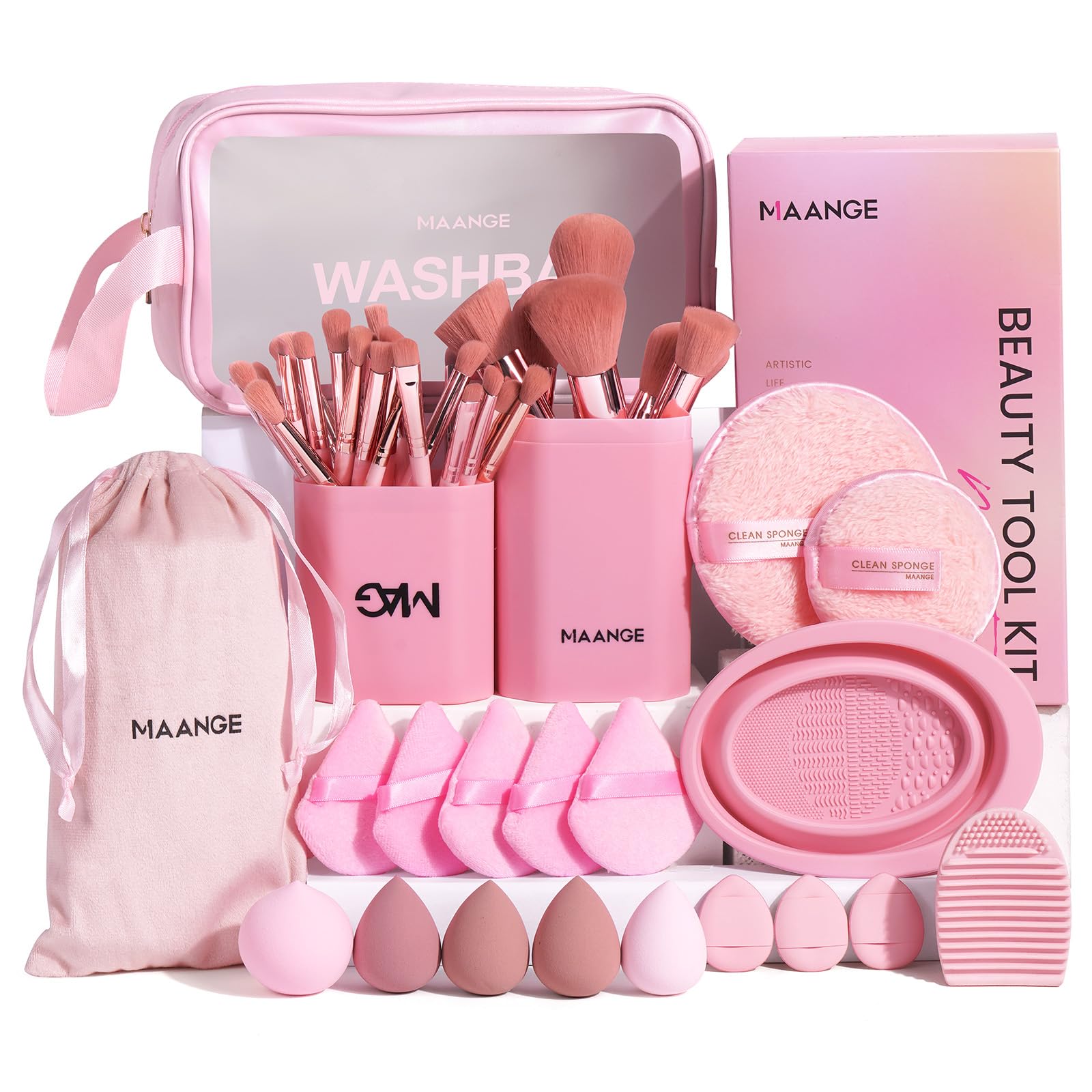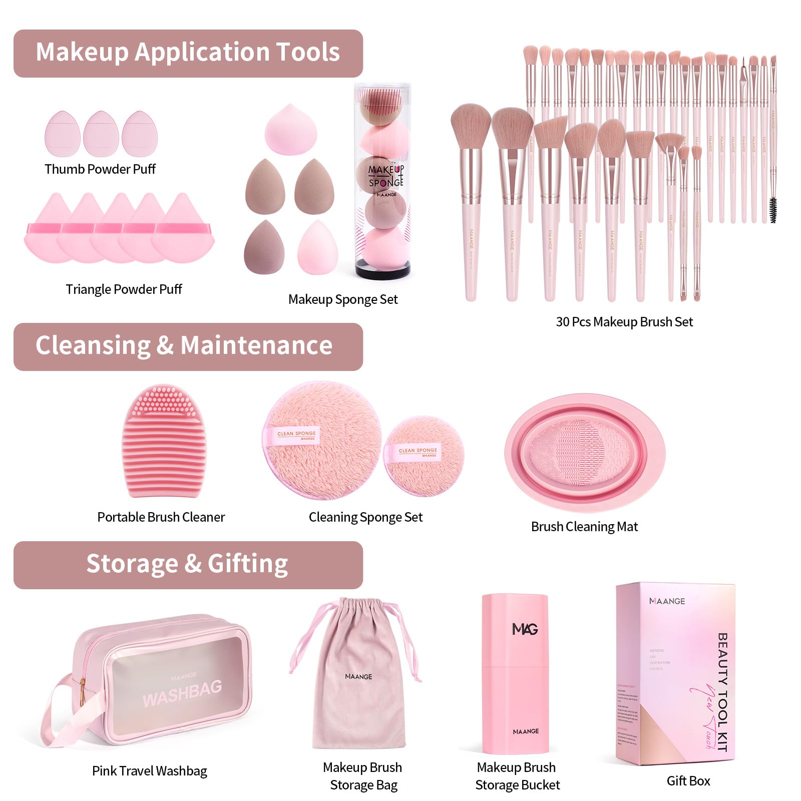 - Upgrade MAANGE Makeup Brush Set: The complete 51 PCS makeup brushes set includes 30 essential makeup brushes, 5 makeup sponges, 5 triangle powder puffs, 3 mini puffs, 2 makeup removal puffs and 2 cleaning pads, a velvet pouch, a brush case, a toiletry bag and exquisite package box.