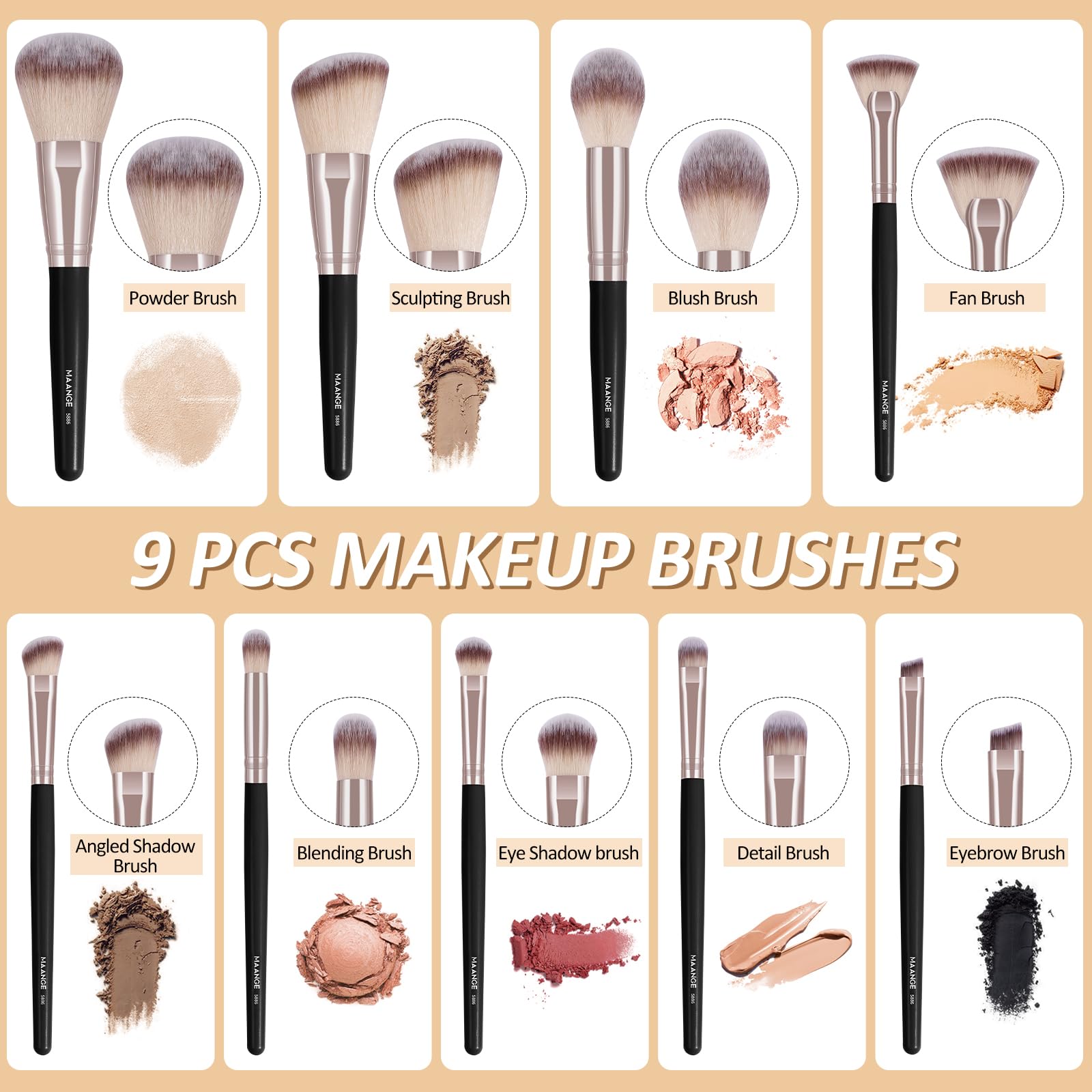 - MAANGE MAKEUP BRUSH SET: Contains 9 basic makeup brushes for eyeshadow, blush, powder etc. 1 makeup sponge and 1 black case. A complete set of makeup equipment to create a flawless natural look, save the worry and effort, and Let each makeup brush give full play to its effect and not be left unused.