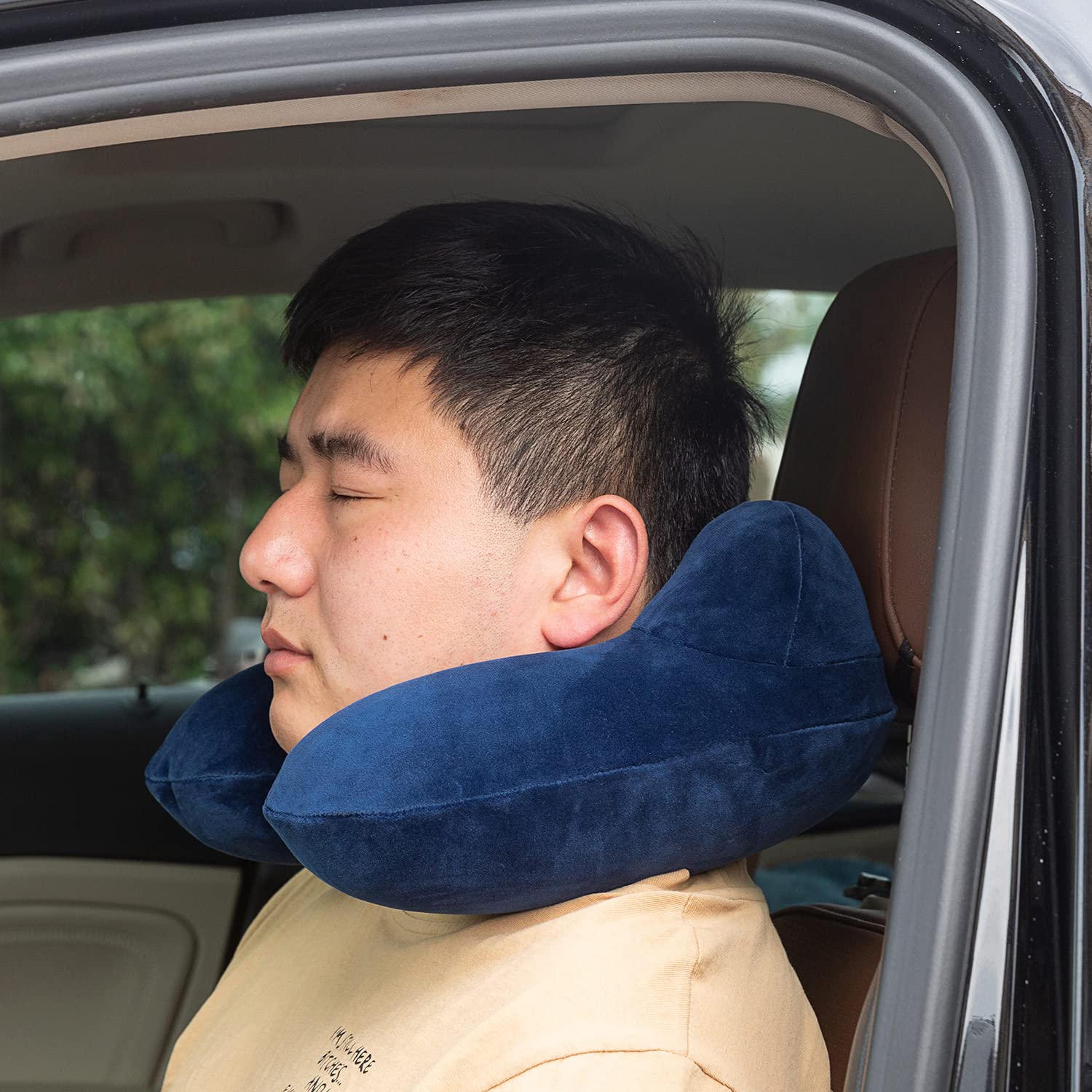 Makimoo Inflatable Travel Pillow, Neck Pillow Support for Traveling, Airplanes, Cars, and Offices with Compact Carrying Bag, Soft Velvet Washable Cover, Ideal for Adult Sleepers (Blue)