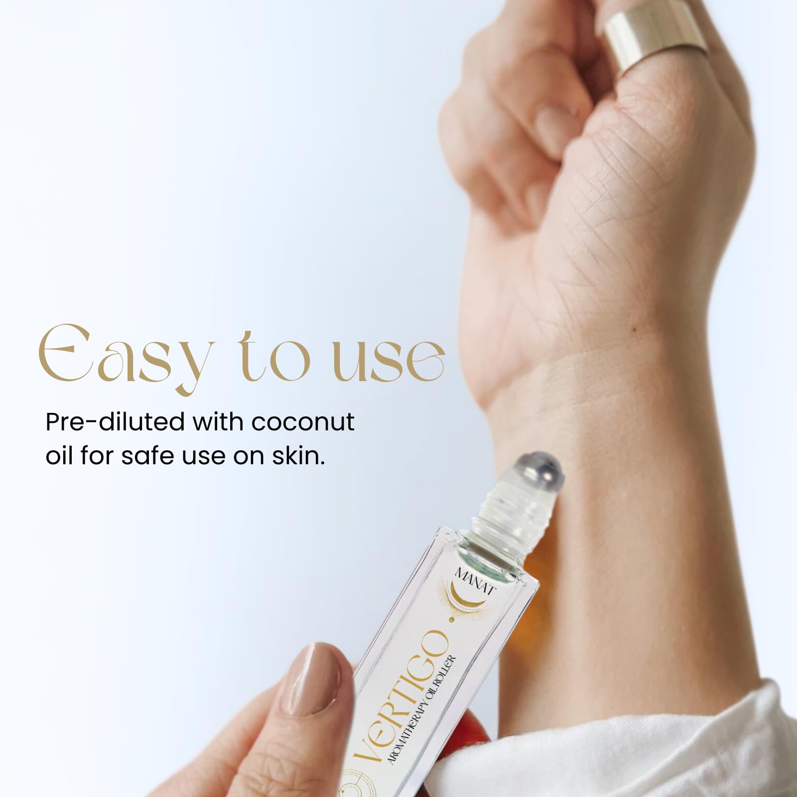 - SAFE & EFFECTIVE: Our Vertigo essential oil has been pre-diluted with coconut oil making it safe for use on skin. Packaged in a 10ml glass bottle with a metal rollerball for effortless application, this essential oil blend helps you regain your composure and feel grounded. Swipe rollerball on pulse points; wrist, neck, and temples. Avoid contact with eyes. Reapply as desired. Perfect for on-the-go relief, travel, post stress balance, or gifting.