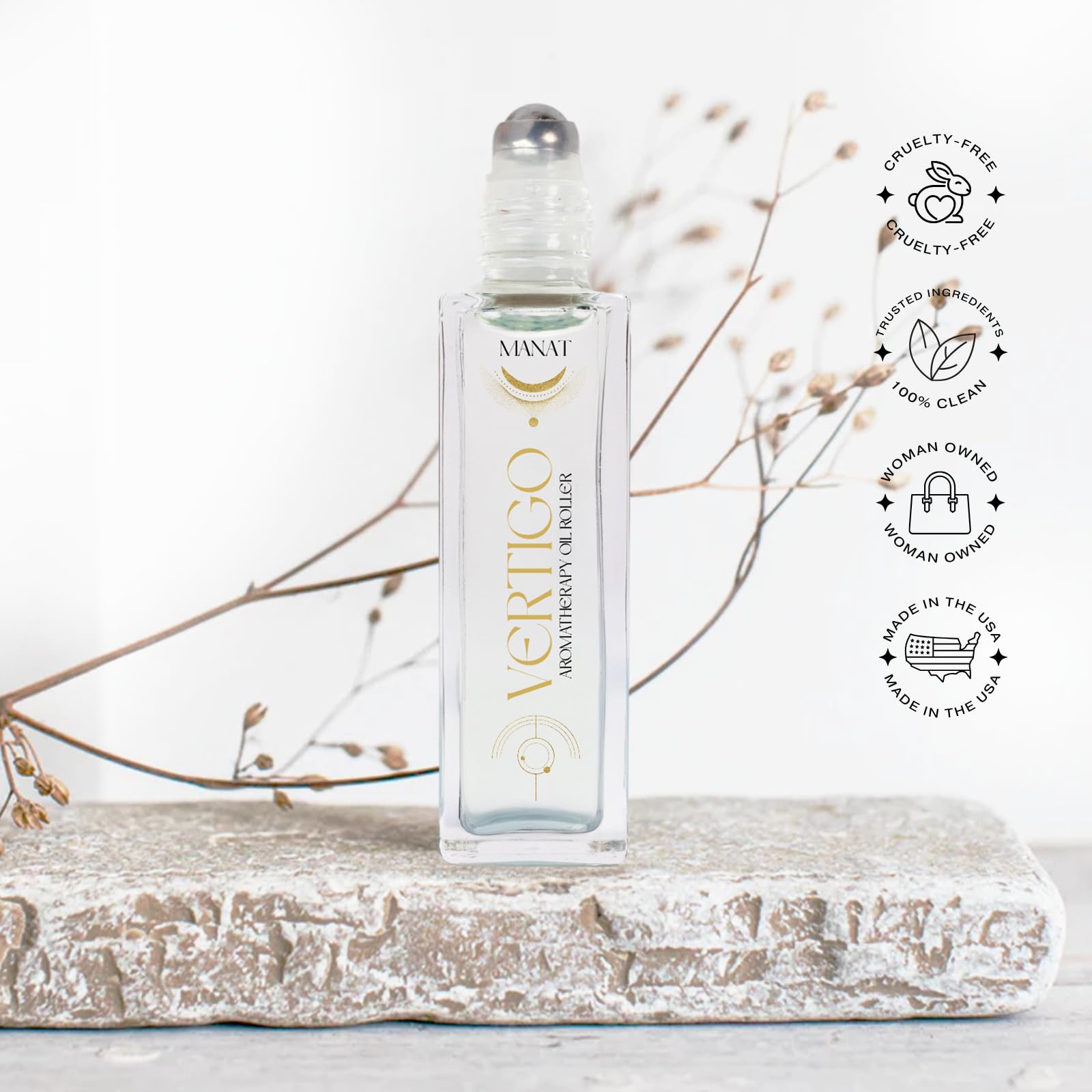 Manat Vertigo Essential Oil Roll On –100% Natural Aromatherapy – 10ml Glass Roller Ball – Dizziness Reduction, Blance & Clarity Blend w/Peppermint, Ginger & Orange - Relaxation, Self Care, Gift