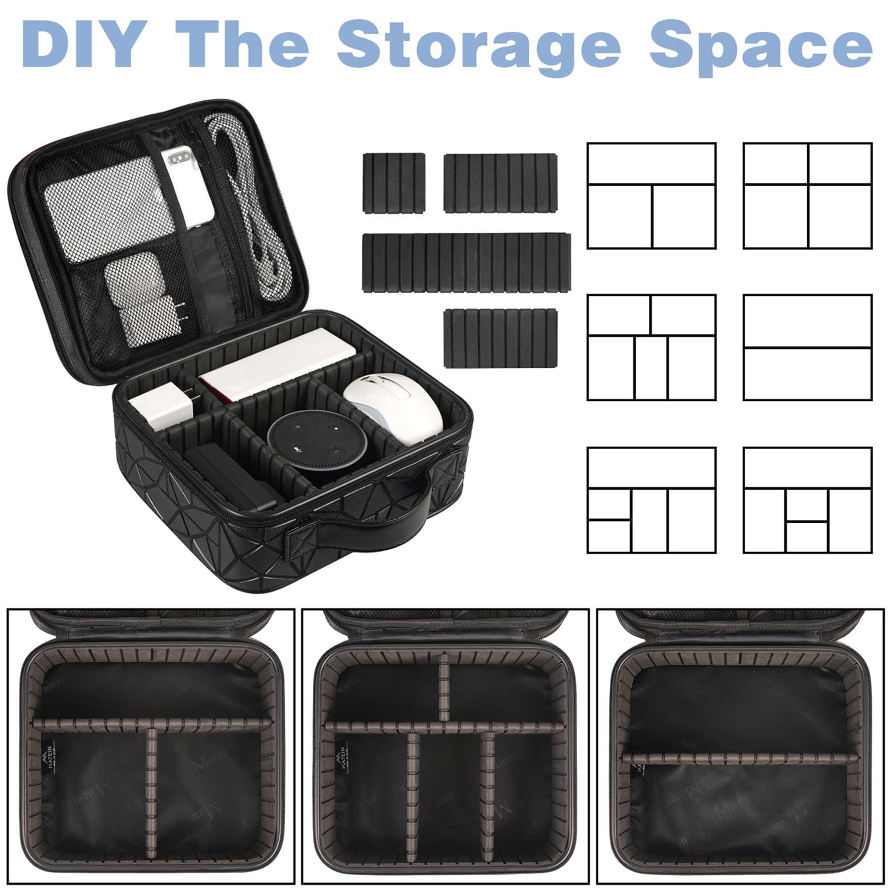 - Diy & Large Capacity: This Cable Organizer has an amazing storage space. Four removable strong shock-absorbing partition protect all items inside from scratches, impact and accidental falling. According to your needs, you can easily carry out various items. A variety of design layouts bring unlimited possibilities to your storage space
