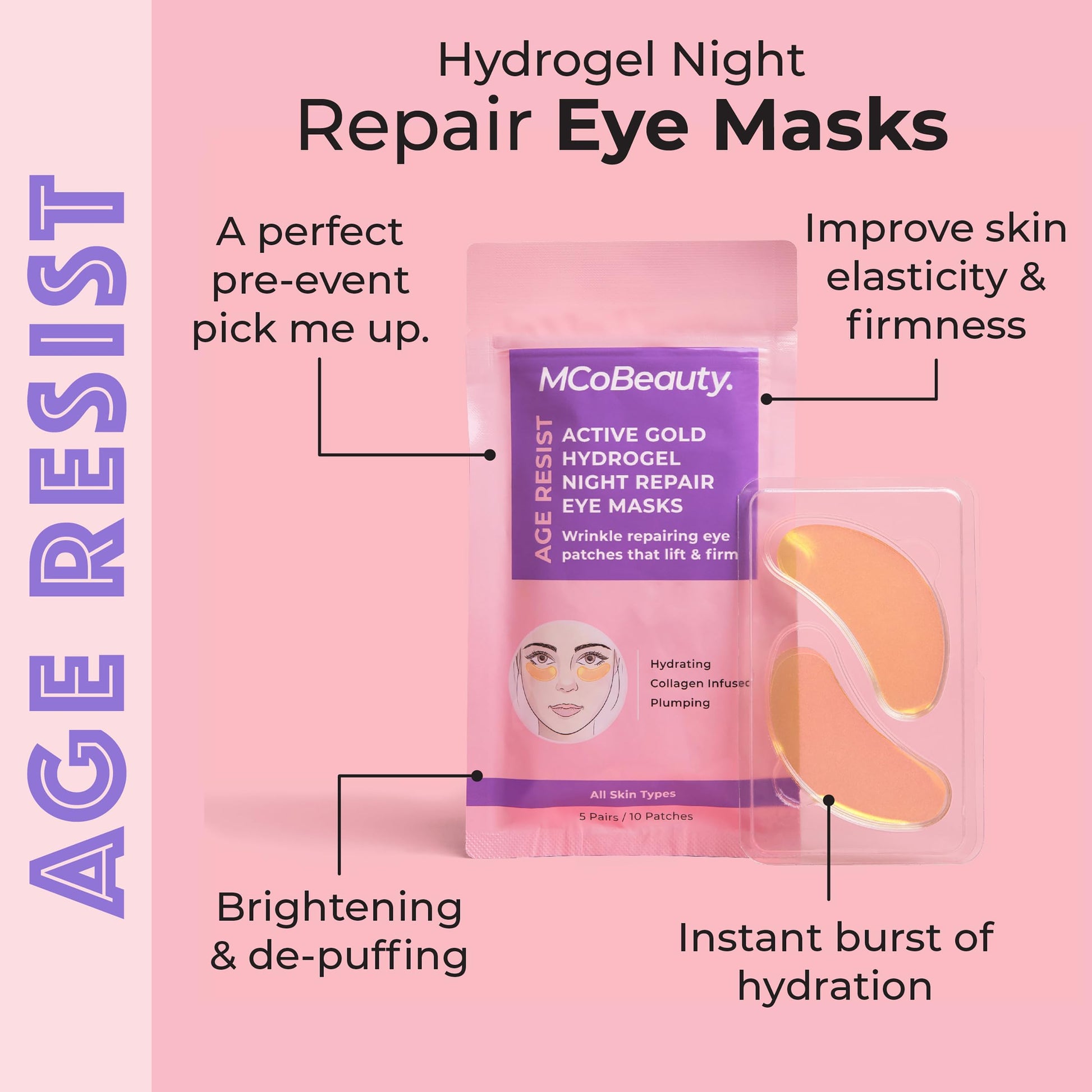 - HYDROGEL NIGHT REPAIR EYE PATCHES: Refresh tired eyes with the MCoBeauty Age Resist Active Gold Hydrogel Night Repair Eye Patches, designed to hydrate, brighten, and de-puff.